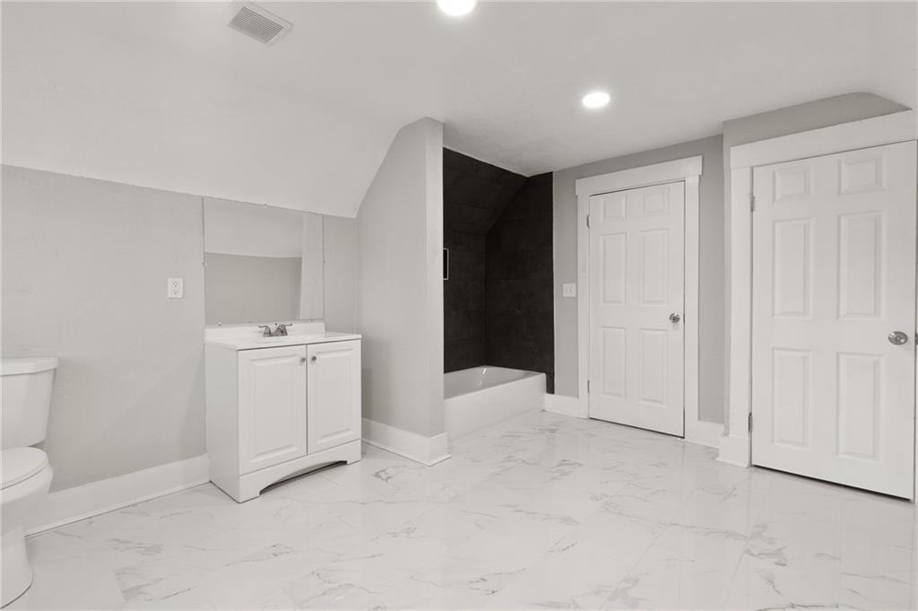Step into this beautifully updated home where every detail has been thoughtfully refreshed. The bright, open foyer welcomes you with gleaming hardwood floors, soaring ceilings, and an elegant staircase that sets the tone for this stunning property. Natural light pours through oversized windows, highlighting the fresh neutral paint and crisp white trim throughout. The heart of the home features a completely renovated kitchen with white shaker cabinetry, sleek granite countertops, modern subway tile backsplash, and stainless steel appliances—perfect for both everyday living and entertaining. Retreat to the spa-like bathroom showcasing designer marble-look tile flooring, modern fixtures, and a dramatic black accent wall in the shower/tub area that creates a striking contemporary feel. The spacious backyard offers mature trees and endless potential for outdoor enjoyment. This home combines classic architectural charm with modern updates—truly a rare find that's move-in ready and waiting for you!