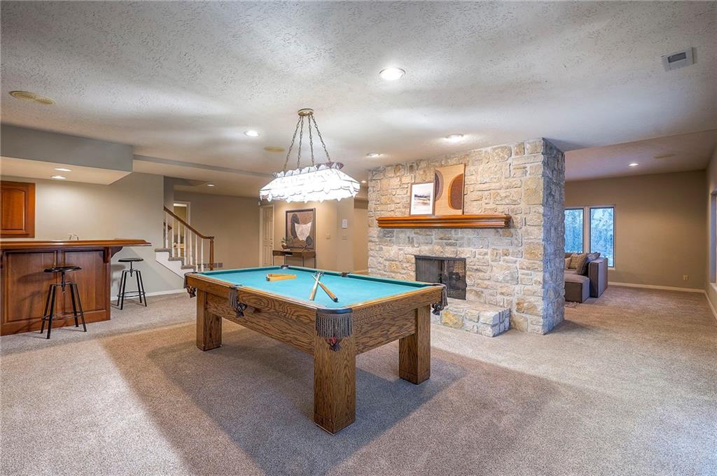 Welcome to this expansive and well-built 1.5-story home offering 4,224 square feet on the main & second floors, plus a large finished walkout basement with 1,500 finished square feet. The home sits on a beautifully landscaped lot in a prime Overland Park location. You’re greeted through a leaded glass front door from a charming courtyard into an impressive two-story entry, where a nearby three-story fireplace anchors the home & immediately showcases its grand scale. The main level features a spacious living room with wood beams, a fireplace & abundant natural light. A large formal dining room easily accommodates entertaining on a grand scale. The kitchen boasts several high-end Wolf appliances & a four-burner gas stove with a griddle. Just off the kitchen is an exceptionally large laundry room. The main-floor primary suite features a vaulted ceiling, generous closet space, and an en-suite bath with separate tub and shower and extensive storage. The second floor offers three very large bedrooms, excellent closets, and two and one-half bathrooms. The half bathroom could potentially become a second laundry room. There is also a bonus room featuring a wet bar, a fireplace and a large vaulted ceiling. It has the potential to serve as a second primary suite. The finished walkout basement is designed for entertaining, with a large bar, multiple gathering areas, wine storage, an additional bedroom and full bath, and access to a spacious patio. There is also significant unfinished space. Additional highlights include a huge deck overlooking the private lot, mature landscaping, a deep side-entry garage well-suited for large SUVs, trucks, and storage, zoned HVAC, partial HVAC replacement, and a major investment in several newer windows. This home offers a rare opportunity—exceptional bones, generous proportions, and a premier location with excellent schools, quick highway access, and nearby shopping and dining—ready for the next owner to bring their design vision to life.