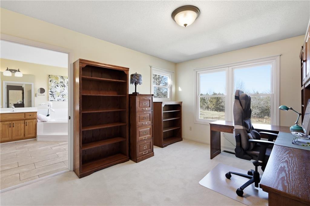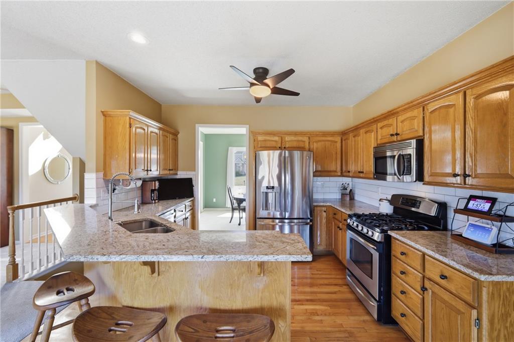 Welcome to this beautifully maintained 4-bedroom, 3.5-bath home nestled on a serene 1-acre cul-de-sac lot in the De Soto School District. Surrounded by mature trees and peaceful outdoor space, this property offers the perfect blend of privacy and comfort. Inside, you’ll find a spacious kitchen featuring granite countertops, a gas stove, and stainless-steel appliances, all opening seamlessly to the inviting great room with a cozy fireplace—ideal for everyday living and entertaining. An additional room on the main floor is separated by glass French doors and provides flexibility for a home office, playroom or sitting area. The primary suite is a true retreat, complete with a versatile bonus space perfect for a home office, nursery, workout room, or sitting area. The large primary bathroom is topped off with a heated bathroom floor and very large walk in closet with attic access space behind for more storage. The finished walk-out basement expands your living options with additional living space, recreation room or even an extra bedroom! A full bathroom, closet, and generous storage are available. Step outside to enjoy the above-ground pool with durable composite decking, perfect for summer gatherings. The 3-car garage has extended length stalls. Recent updates and highlights include: Roof approximately 1.5 years old; New gutters (2025); Windows less than 10 years old and professionally wrapped to help seal out noise and prevent wood rot; HVAC system approximately 5- 6 years old, James Hardie low maintenance siding. With its flexible layout, major system updates, and prime location, this home offers exceptional value and move-in-ready comfort. Don’t miss this rare opportunity!