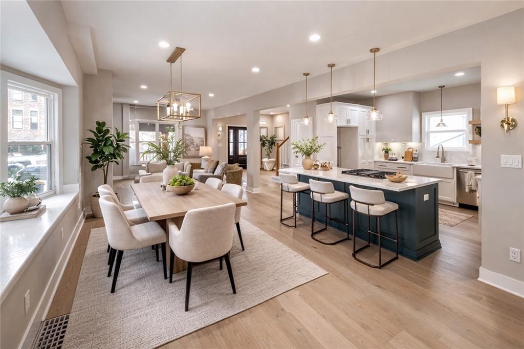 Beautiful Valentine neighborhood 5-bedroom, 3.1-bath fully remodeled home featuring bright, open-concept main-floor living. The spacious family room flows seamlessly into the kitchen and dining area, perfect for everyday living and entertaining. The kitchen showcases brand-new cabinetry, quartz countertops, and a gas range. A convenient half bath is located on the main level. The second floor offers a large primary bedroom with a walk-in closet and a stunning en-suite bath featuring tiled floors, a tiled shower, and double vanities. Two additional bedrooms, a full bath, and a laundry room complete the second level. The third floor includes bedrooms four and five along with a third full bath, providing flexible space for guests, offices, or additional living needs. Enjoy a private driveway with extra parking at the rear of the home. A must-see property offering modern finishes, space, and comfort throughout.