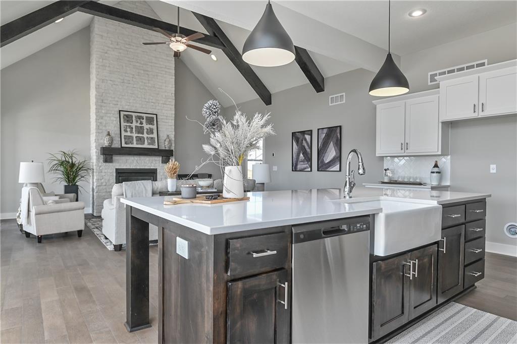 This home is perfectly situated at the end of a quiet cul-de-sac, adjacent to a public golf course. The stunning Reverse 1.5-Story Aspen by Prieb Homes offers a spacious, open floor plan filled with impressive details throughout. Soaring vaulted ceilings with stained beams and striking stonework surrounding the fireplace create a grand first impression upon entry. The kitchen is designed for both entertaining and everyday living, featuring a massive granite center island and ample workspace. The primary suite serves as a relaxing retreat, complete with an adjacent bonus office space and a conveniently located laundry room with built-in cabinetry. The spa-like primary bath includes a custom shower and separate vanities. The finished lower level expands the living space with a wet bar, two additional bedrooms, and a full bathroom—perfect for guests or recreation. Step outside to the large covered 14x12 deck and enjoy peaceful views. Room sizes and taxes are estimated, and some features may not be available in this spec home. Buyer’s agent to verify all information. Some Pictures are of completed plan, decor selections and front elevation orientation to vary.
