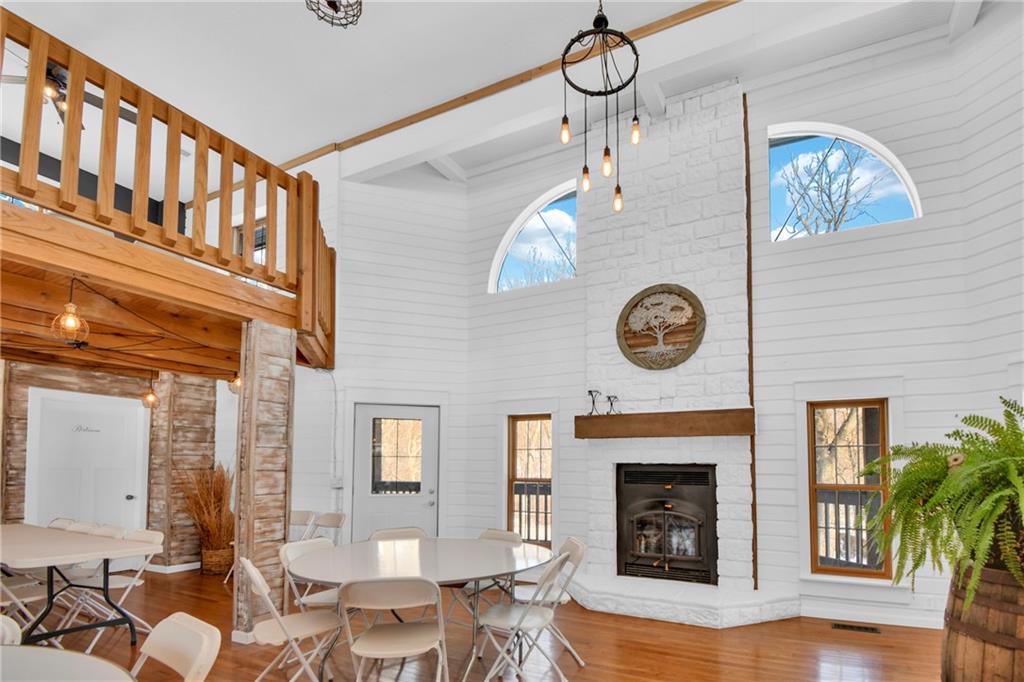 Nestled on over 51 acres of picturesque, rolling Missouri countryside, Sycamore Ridge Event Space is a rare gem for anyone seeking a versatile, income-producing venue or private retreat. The custom log cabin-style main building features warm, inviting interiors with high vaulted ceilings, exposed beams, a striking stone fireplace, and flexible event flooring — ideal for weddings, receptions, parties, corporate retreats, or family reunions. Multiple porches and balconies provide sweeping views of the property's wooded ridges, meandering creek, and open fields, while the expansive stamped concrete patio (complete with string lights and scenic backdrops) accommodates large outdoor ceremonies or receptions for 200+ guests. Additional highlights include a dedicated bridal suite, restroom facilities, commercial prep kitchen, storage barns, and ample parking. This property offers tremendous flexibility — continue as an event venue, add glamping/cabins, or enjoy as a private homestead with room to roam. Peaceful, private, and conveniently located just a short drive from Kansas City metro — Sycamore Ridge truly delivers serenity with endless possibilities. Buyer & Buyer's Agent to verify all information including square footage, zoning, taxes & room sizes during the Inspection Period.