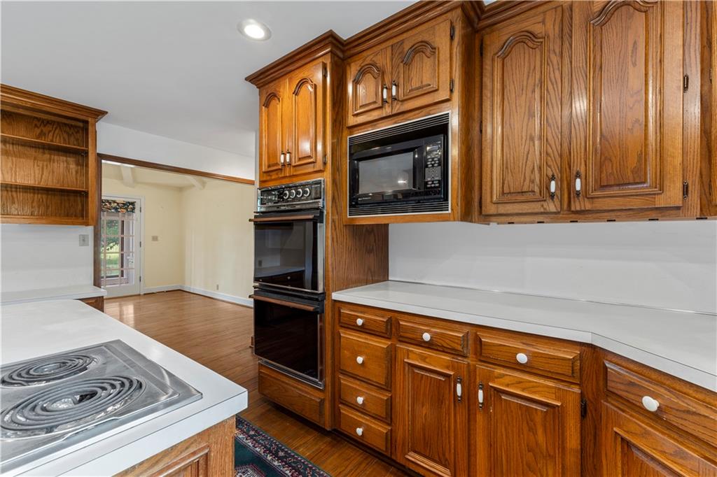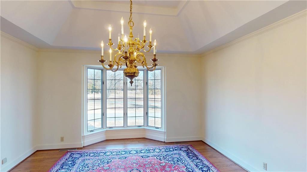 Take advantage of the rare opportunity to own a stately, full brick home perfectly positioned on 2.3 sprawling acres (m/l) just outside the city limits of Nevada, MO. The grand arched glass entryway opens into a light-filled foyer, offering a stunning view of the winding staircase that sets the tone for the home's architectural character. The main level has been elevated with brand-new wide-plank wood flooring, custom-milled in South Carolina, flowing from the entry and encompassing the formal dining room, kitchen, breakfast nook, walk-in pantry, and hallway. Host gatherings in the formal dining room under a tray ceiling and elegant chandelier, with a bay window framing the lush front lawn. The living room is a breathtaking sanctuary of comfort and style. Soaring high ceilings are accented by crown molding and wainscoting, creating an atmosphere of timeless sophistication. At the heart of the room sits a cozy fireplace, while a wall of windows bathes the space in natural light and offers serene views of the sunroom and the classic brick patio beyond. The library is a true retreat featuring a coffered ceiling, custom built-in shelving, a second fireplace, and a wet bar with glass shelving—the ultimate setting for a home office or quiet evening. Enjoy slow mornings under the beamed ceilings in the breakfast area, or step into the sunroom with classic brick flooring, accessible from both the living and breakfast areas. The primary suite, located on the main-level offers walk-in closets and a spacious en-suite bath with with double vanities, a garden tub, and separate shower. Designed for convenience, the main-level also includes two half-baths, a laundry room, and a walk-in pantry providing ample storage and effortless functionality. The upper level provides two additional bedrooms and bathrooms. While the full, unfinished basement includes a third fireplace, providing a versatile space where the possibilities are endless.