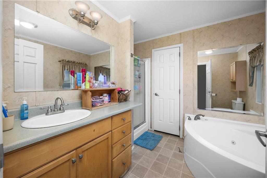 Sometimes all you really want is space, a good view, and a little peace and quiet. This 3-bedroom, 2-bath manufactured home sits on 27± fenced acres just west of Coffeyville with easy access to Hwy 166. The home offers a functional layout for easy living. In the living room you will find a wood-burning fireplace for cold winter nights. The eat-in kitchen has a small island with storage underneath. The primary bedroom has an en suite bathroom featuring a stall shower and jacuzzi tub- perfect for soaking the stress away. The land is fully fenced with a cattle guard by the house and chain-link fencing in the backyard, making it ideal for livestock or pets. A two-car carport and storage shed provide added convenience. The pond is the standout feature—perfect for fishing, relaxing, and enjoying quiet country evenings. The home does need some updates, including hail-damaged siding on the west side and carpet replacement, offering buyers an opportunity to update and add value. A deck in the backyard is ready for repair and personalization. This property offers open pasture, scenic views, and peaceful country living with close proximity to town. Call to schedule a tour today!
