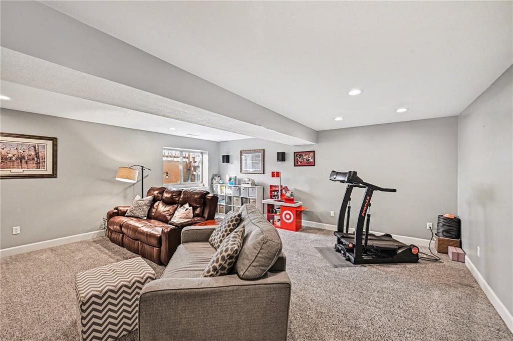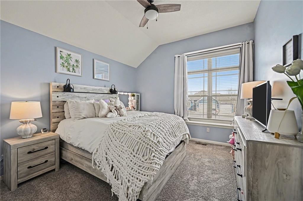 Welcome to 17802 Grey Hawke Ridge. Upon entry, you are greeted by beautiful wood floors and a bright living room filled with natural light. The dining room continues the airy feel with additional windows and flows seamlessly into the kitchen, which features classic wood cabinetry, stainless steel appliances, and a walk in pantry. Vaulted ceilings throughout the main floor enhance the open and spacious feel of the home. This open concept layout continues into the light filled family room, complete with a custom fireplace and built in shelving, making it the perfect space for gatherings with family and friends. The main level is complete with a convenient half bath for guests and access to the three car garage. Upstairs, you will find three bedrooms, including one with a walk in closet. The primary suite offers a private ensuite bathroom with a soaking tub, separate shower, and its own enclosed water closet, along with a very large walk in closet. The upper level also includes a full bathroom with double sinks and a conveniently located laundry room. The lower level features a recreation room and a utility and storage room connected through a sliding barn door, adding charm and character to the space. Step outside to enjoy the covered back patio, perfect for hosting family and friends, overlooking a very spacious backyard that offers plenty of room for outdoor activities and entertaining.