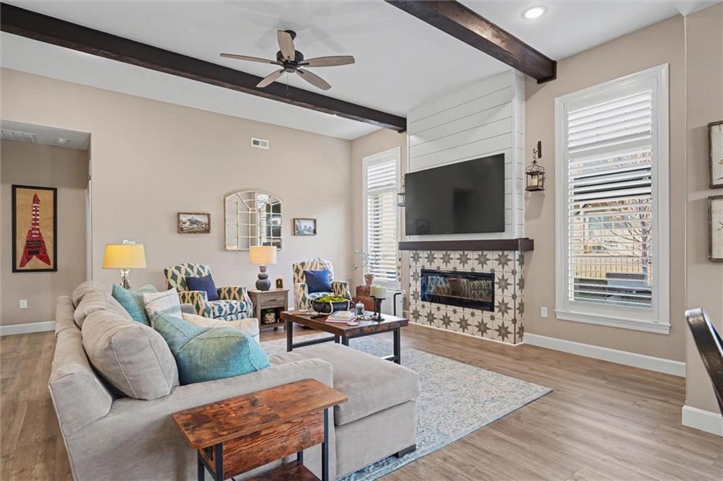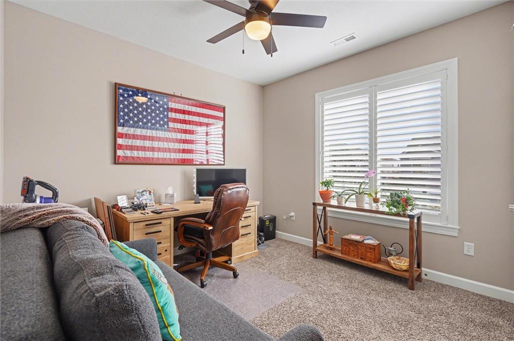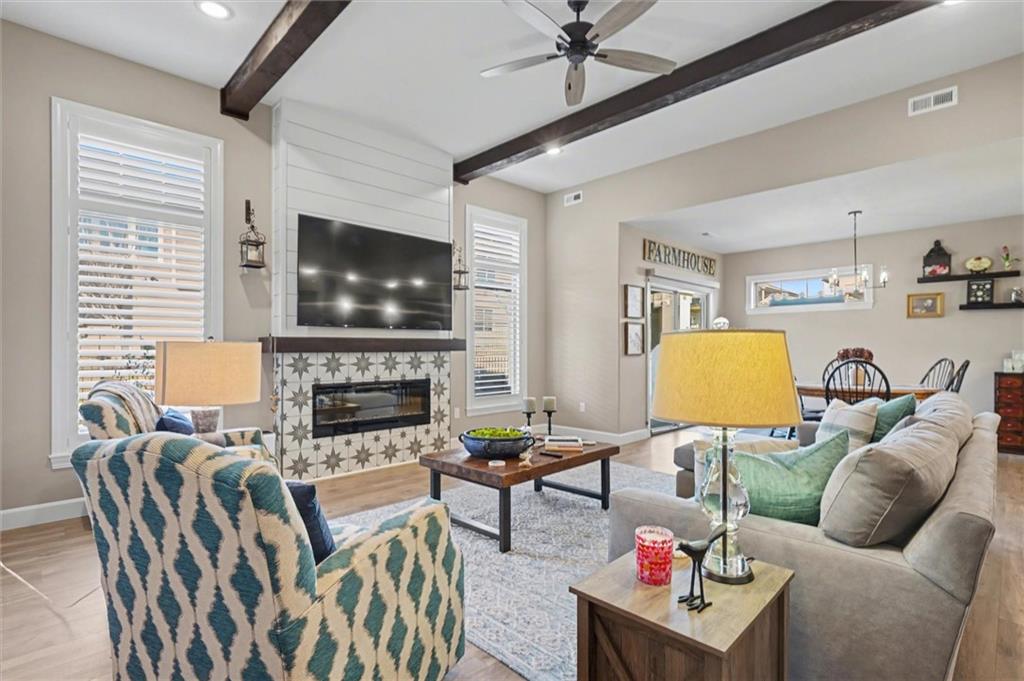 This home still feels new with all the upgrades in popular Hutton Farms. Plantation shutters, gas range, covered patio on the back with rocking chairs greeting you on the front. Drippe Construction created this open concept floor plan with high vaulted ceiling and cross beams. Master closet flows through to the laundry room. Gated community with HOA that covers snow removal of streets, lawn care and sprinkler system. Homeowner responsible for grass inside of the fence.