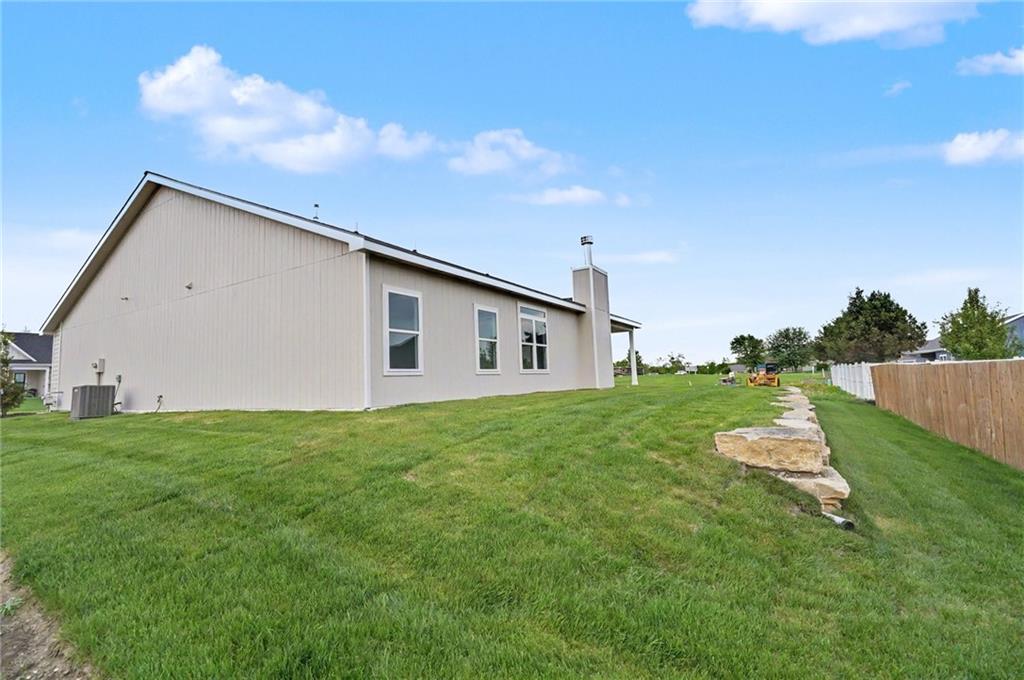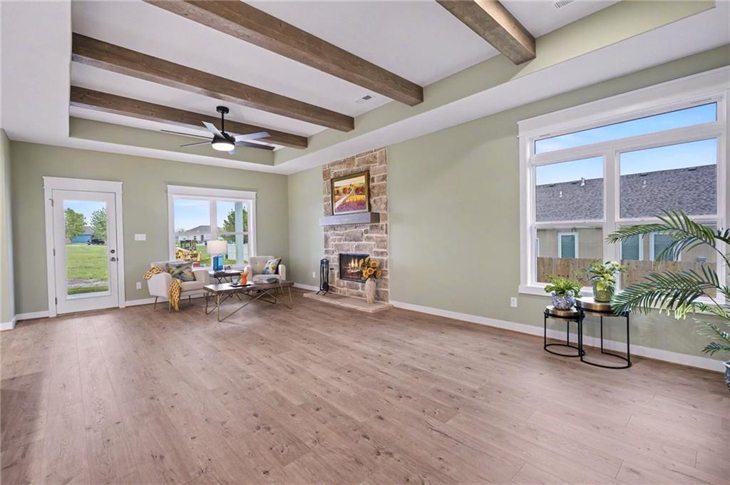 This impeccably built 3 bedroom, 1 and ¾ bath home offers 1,805 sq ft of comfort, quality, and timeless style. A welcoming wainscoted entry, designer interior doors, and quality finishes throughout elevate the home’s character. The kitchen is both functional and inviting, featuring a large island with farmhouse sink, an impressive gas range, and a 47-decibel ultra-quiet stainless steel dishwasher, ideal for entertaining or everyday living. The open living room is anchored by a stunning natural native Kansas limestone fireplace surround, wood burning fireplace made easy with gas log lighter, accented by exposed timber beams that continue into the primary bedroom for a warm, rustic elegance. Retreat to the primary bedroom enhanced by a custom designed accent wall and coffered ceiling, en suite primary bath boasts a large walk-in closet, walk-in shower and double vanity. The generous laundry room with sink adds convenience and practicality. One level living complete with an insulated 3-car garage for added ease and storage. Sound insulation in living areas and bathrooms and an insulated perimeter floor slab enable year-round comfort and quiet living. This thoughtfully designed home offers modern amenities and quality construction; perfect for those seeking space, style, and serenity.