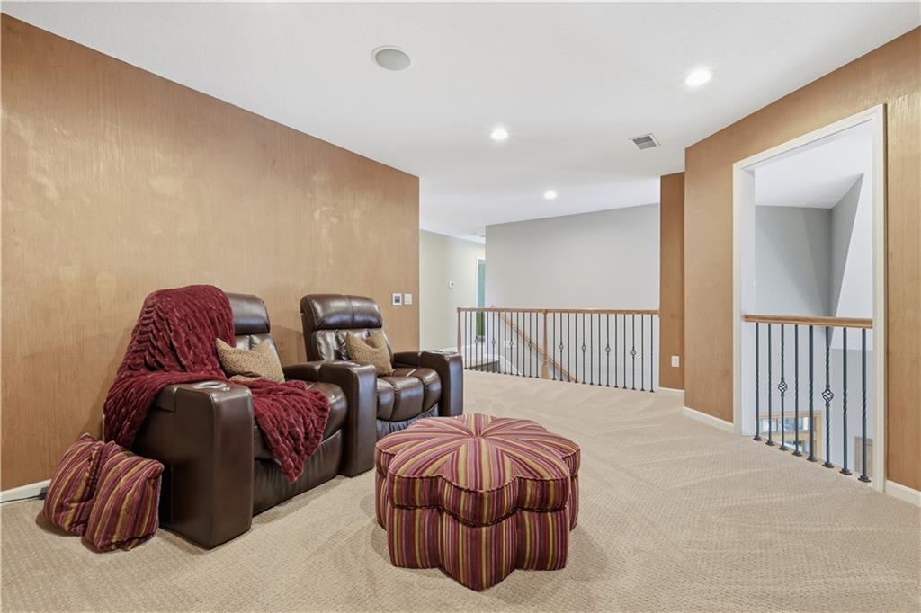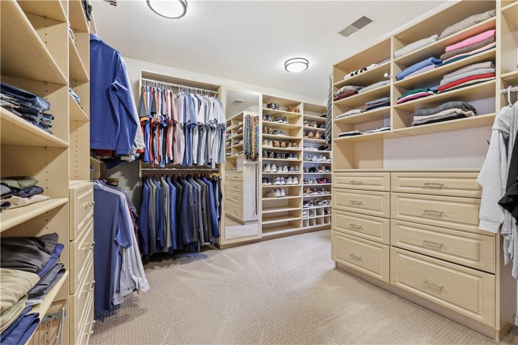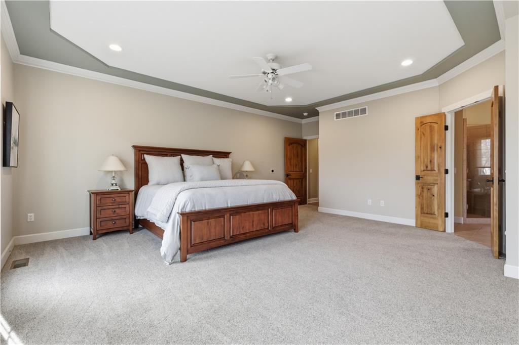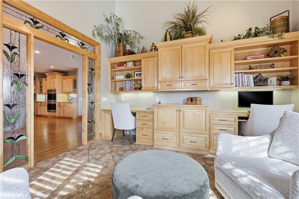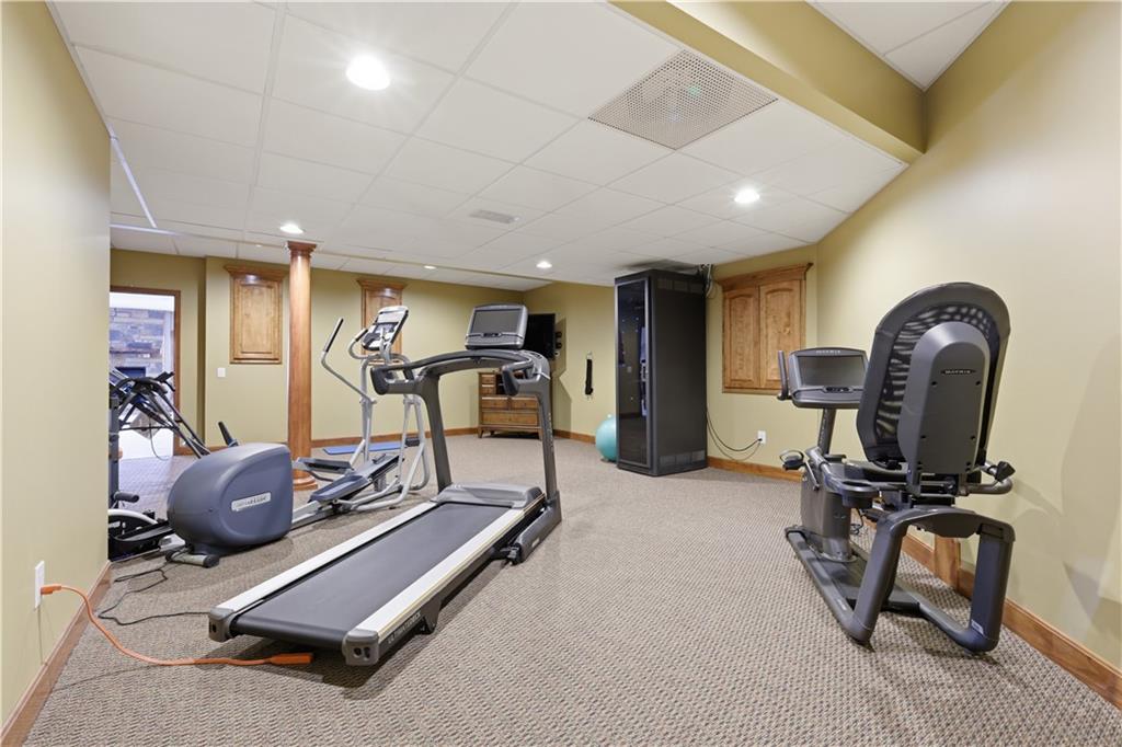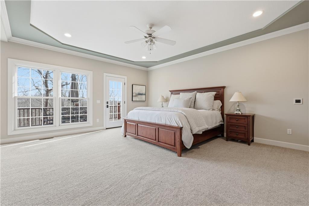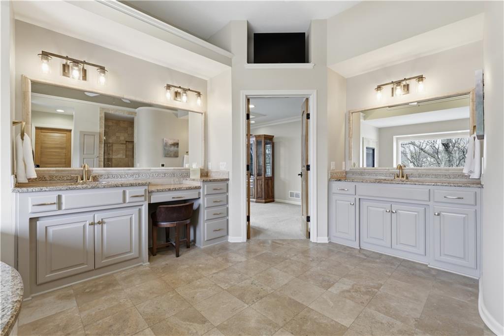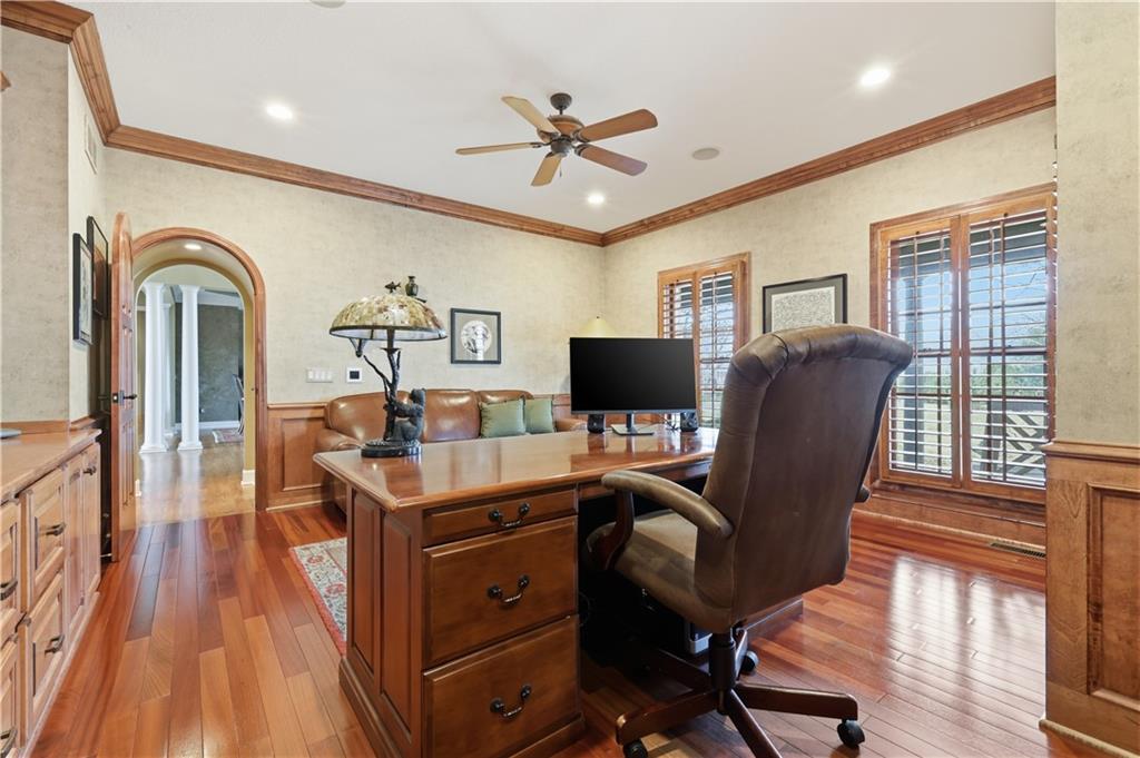 Stunning 8,355 SF estate at the end of a quiet cul-de-sac in highly sought-after Winterset Woods. Situated on a private .84-acre lot backing to maintained wooded green space and the community's 100 Acre Woods. This home offers exceptional privacy with direct trail access to the Rock Island Trail. Main level features newly refinished hardwood floors, formal dining and living rooms, a spacious family room, gorgeous sunroom, walk-in pantry, and private office with side entry front porch access. The updated kitchen showcases natural maple cabinetry, quartzite counters, new Wolf double ovens & Wolf induction range and new remaining appliances. This home offers two master suites. The main-floor master suite includes a spacious bath with Jacuzzi tub and private deck access. The 2nd level master suite has cathedral ceiling framing tree top views. Bath has heated tiled floor and a Jacuzzi River Bath. Closets feature California Closet design. The remaining 2nd level offers a loft and 2 suites with private baths, highlighted by Alder hardwood doors and Renewal by Andersen windows. The walkout lower level is built for entertaining with a large rec room, gas fireplace, full bar, billiards area, guest suite with full bath, second laundry, custom wine cellar (1,000+ bottle capacity), additional rec space, and nearly 1,400 SF of storage. A storm shelter/vault is located beneath the front porch. Outdoor living includes multiple decks, screened porch, covered patio with finished dry ceiling and shiplap detail, gas fire pit, ornamental iron fencing, and additional dry storage below the south deck. The 4-car garage (998 SF) provides ample space. Roof replaced in 2020 with copper detailing. Perfect location with easy proximity to I-470. Just minutes from Lowenstein Park, The Streets of West Pryor, and Summit Woods.