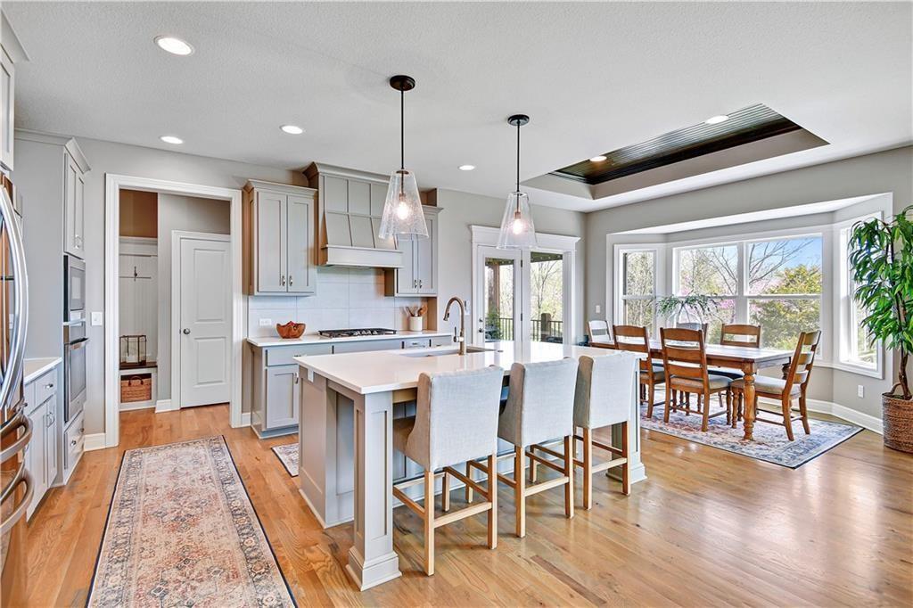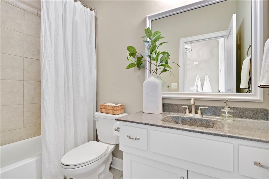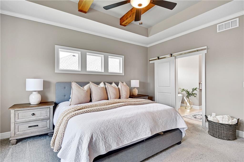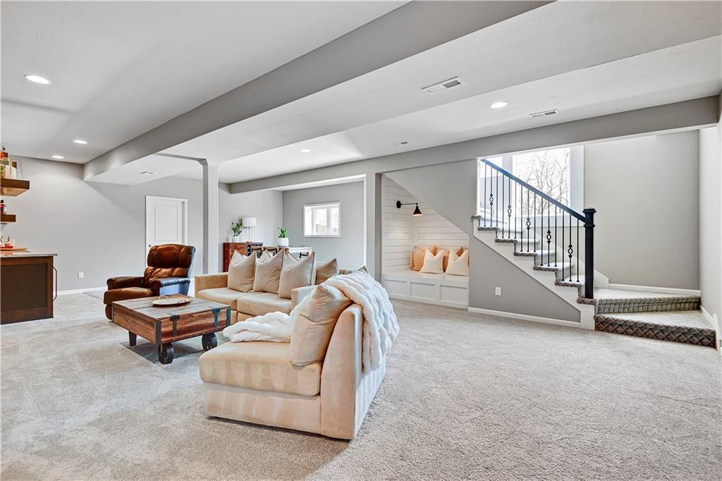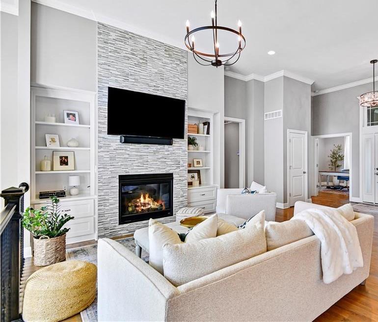 Stunning Reverse 1.5 Story in a fantastic neighborhood with fabulous amenities. This home backs to green space for privacy and views! Walk in to a wall of windows that take in the beautiful treed green space. There is an office or guest room at the front of the home and full bath. The primary bedroom is a delightful retreat with high ceilings & great views and a spacious and modern ensuite with separate tub & shower, double vanities & a huge walk-in closet. The kitchen is great for entertaining with an oversized island, neutral colors and classic design choices. You will fall in love with the covered deck that was greatly improved with an automatic, remote controlled MagnaTrack rolling screen that is engineered to withstand hurricane force winds and with the screen woven so tight it actually adds privacy (you can easily see out, but you can't see in), it blocks the sun, wind, bugs, and creates such a comfortable atmosphere that the sellers use that space year round. The walkout lower level has a wet bar area which makes the recreation room truly functional. There are two more guest rooms & a full bath and two separate storage areas. The back yard is fenced with iron fencing, so no maintenance, and strong enough to withstand a tree falling. It has 3 gates and is built in sections making it ideal for the long term. The garage floor has been epoxied. Integrated water softener system stays. Alarm system stays including window sensors. Interior freshly painted with highest grade of Sherwin Williams paint. Close to the pool & tennis, but very quiet street as there is not a lot of through traffic. Deck & railings were stained recently. All shower heads were replaced and kitchen faucet was replaced. Home has been professionally cleaned every 2 weeks and windows have been professionally cleaned inside and out every spring. Neighborhood amenities include multiple lakes/ponds with live fishing, hiking/biking trails, playgrounds, 2 pools, tennis & pickle ball court...