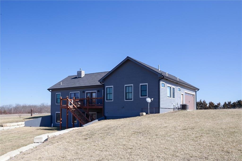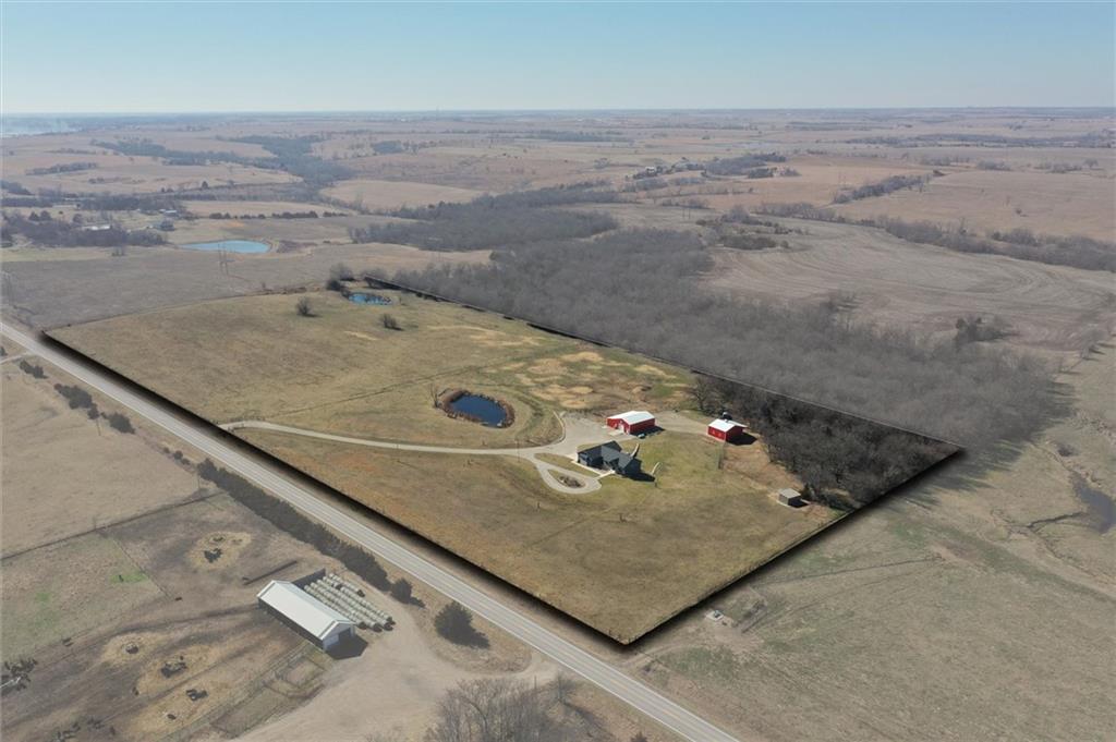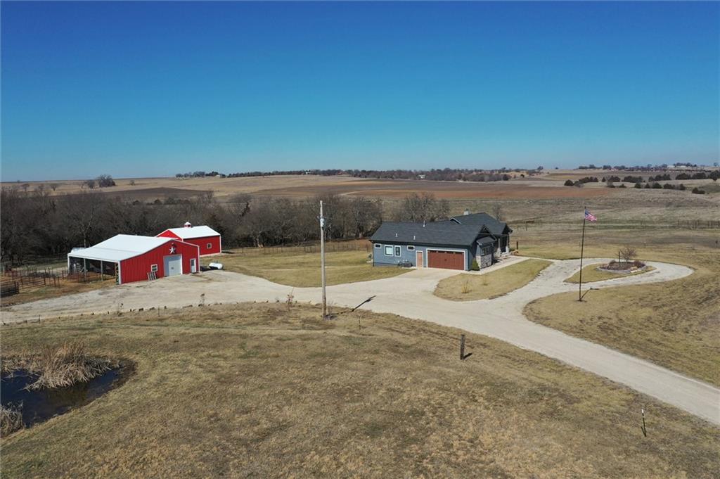 Gorgeous dream home located on 20 +/- picturesque acres. Expect to be impressed upon entering this 4 bedroom, 4 bath ranch. Open floor plan, reclaimed hardwood floors throughout main living area, vaulted ceilings, an abundance of natural light, solid wood doors and upgraded lighting. Great room featuring floor to ceiling stone fireplace, open to stunning kitchen boasting GE Cafe appliances, custom cabinetry with marble pulls and knobs, granite countertops, pot filler, gas stove and walk-in pantry. Large island and dining space to accommodate all of your family and friends making it perfect for hosting gatherings. Step outside to your private deck for enjoying the fabulous sunsets. Great master suite with vaulted ceiling, double vanity, separate shower, relaxing soaking tub and huge walk-in closet. Two additional spacious bedrooms on main level as well. Full finished walk-out lower level complete with wet bar, huge family/rec room, plenty of windows, 4th bedroom, full bathroom, safe room, plus unfinished space for storage. The property also features a 30x50 insulated shop with 200 AMP power, concrete floor, large wood burning stove, 2 separate garage doors (in/out) plus three 16x20 bays with lighting. Newly added 30x34 2 stall stable with commodity area and 30x10 lean to for additional equipment storage or animal cover. The cutest custom chicken house stays too. This remarkable property is not only beautiful, but it virtually has it all! Perfect farm space for cattle or horses, abundance of wildlife, trails through the timber down by the creek and fish in the pond. It is a sanctuary retreat by day and night all year long! Serene environment to call home! All located on hard-surface road. Easy commute to Lawrence, 15 minute commute to Baldwin City and Topeka!