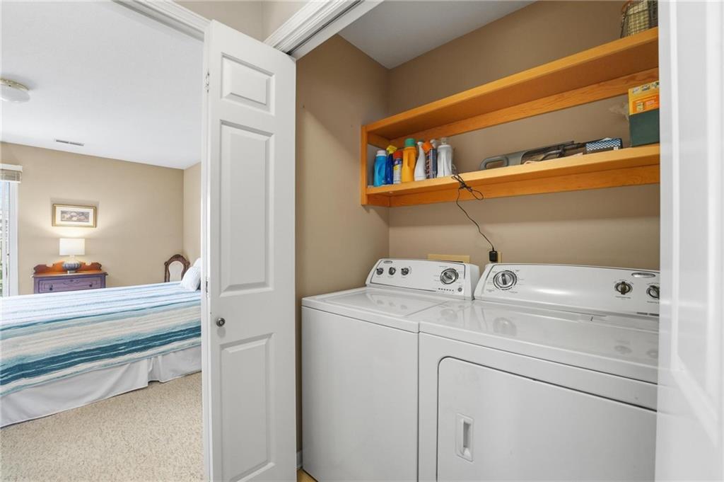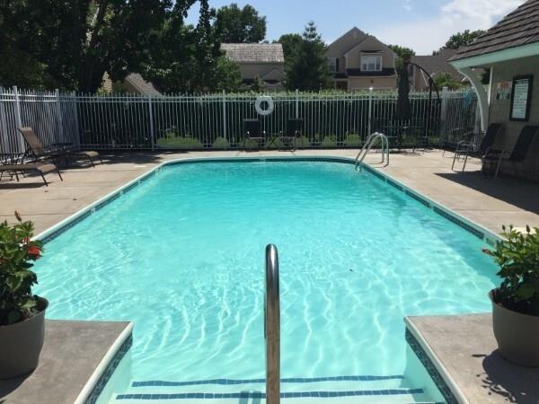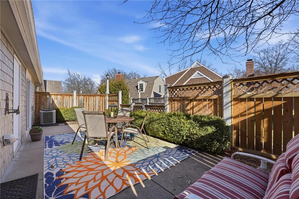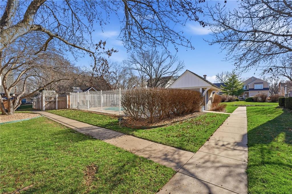 The Cottages in Lawrence is a small community of homes and townhomes designed and built by Gene Fritzel. This charming community boasts mature trees and a private pool. The HOA provides lawn care and snow removal in addition to the well-maintained pool. This town home has been immaculately cared for, and the love of ownership shows throughout. The spacious family room contains a gorgeous brick woodburning fireplace, wood beams, and a sliding door to the large, beautiful patio surrounded by a privacy fence. The warm, inviting kitchen boasts gorgeous cabinets, kitchen island, a bay window (perfect for a breakfast nook), and an ample dining area with a vaulted ceiling. Laundry is located on the main level between the kitchen and primary bedroom. The sizeable, main level primary bedroom features a walk in closet w/shelving and a sliding door to the private patio. The primary bath has an onyx countertop and new faucet. There is a half bath on the main level for guests. The second level has two ample bedrooms separated by a charming full bath. Take a right out of the patio door and follow the sidewalk to the pool! This is a beautiful home in a gorgeous community!