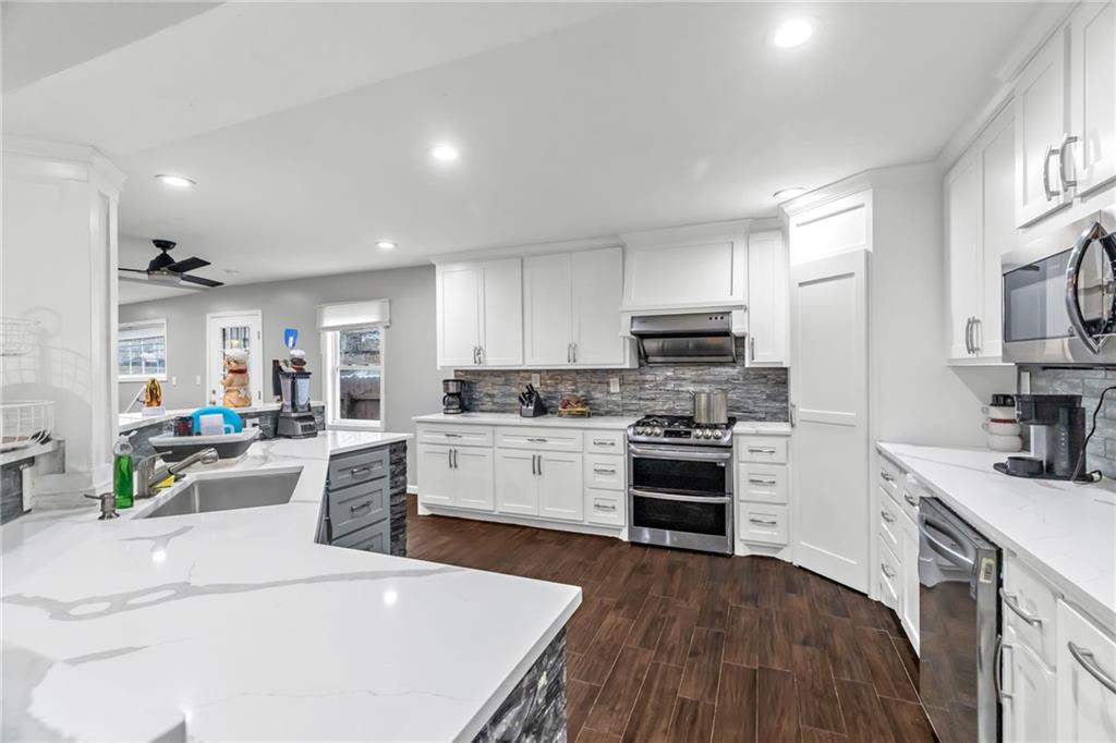 This spacious 5 bedroom, 2.5 bathroom home in Kansas City, KS offers over 3,200 square feet of versatile living space and a layout designed for comfort and flexibility. A long driveway leads to the detached 2-car garage, providing ample parking and convenience. The main level features an open concept living, dining, and kitchen area that feels bright and welcoming. The beautifully updated kitchen is the heart of the home, complete with a large island offering plenty of seating, abundant cabinet space, and a generous pantry for extra storage. The dining area is large enough to accommodate a full-size table, making it perfect for everyday meals or hosting friends and family. A bedroom on the main floor provides great flexibility and could easily serve as a guest room or an office. Upstairs, you'll find an expansive private primary suite that takes up the entire level, creating a true retreat. This space includes a large bedroom along with a bonus den or sitting area that could be used as a home office, lounge space, or another living space. The finished basement adds even more functionality with a full second kitchen, making it ideal for entertaining, extended family living, or additional recreation space. With its generous square footage, open layout, and thoughtful updates, this home offers a unique opportunity for comfortable living with plenty of room to spread out.