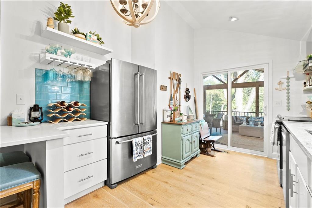 Experience lakeside living at its finest in this charming Lake Lotawana cottage. Perfectly positioned on a spacious .24-acre corner lot with its very own private dock with a boat lift, this home combines modern luxury with the serenity of nature. Step inside to vaulted ceilings and a thoughtfully updated interior featuring quartz countertops, stainless steel appliances, stylish backsplash, and contemporary fixtures. Fully renovated bathroom & two comfortable bedrooms make the perfect place to unwind. A large screened porch opens seamlessly to an expansive deck—ideal for entertaining—while the backyard fire pit provides a cozy setting for evenings under the stars. Surrounded by mature trees and tranquil views, this property embodies peaceful lakeside living. Whether as a weekend getaway or a year-round residence, this cottage captures the true Lake Lotawana lifestyle, from quiet mornings spent fishing, to afternoons on the boat, to evenings entertaining family and friends.