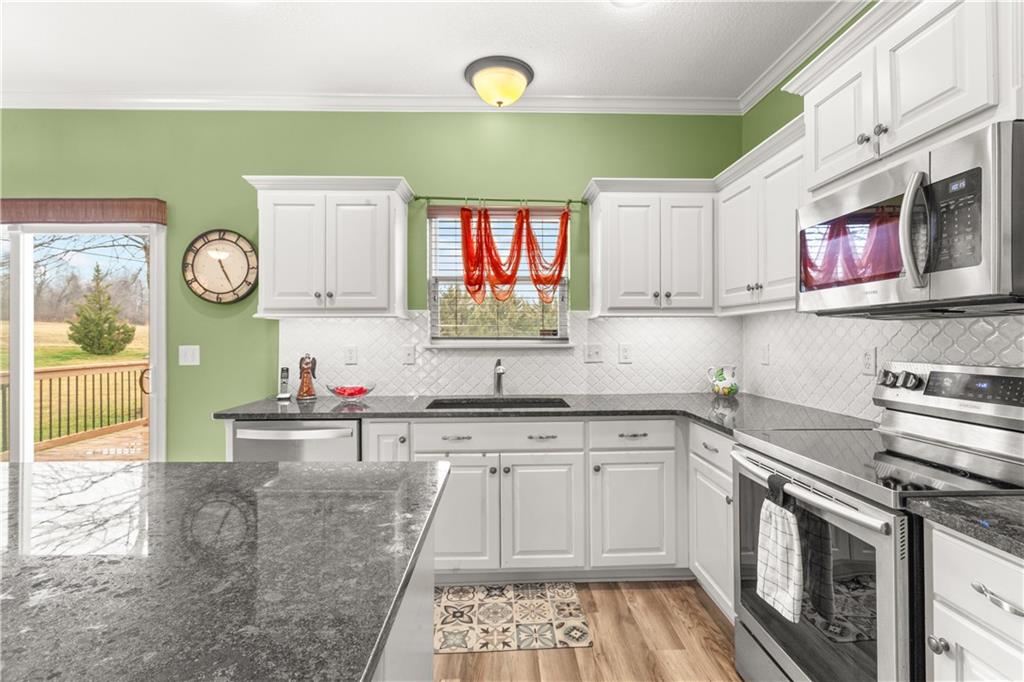 Beautiful property in move in condition. Main bathroom has accessible bathroom shower and large closet. Kitchen has stainless steel appliances and kitchen island. Granite countertops. Open floorplan in kitchen, dining room and living room. Laundry room in hall on main level. Ranch. Large deck and backyard. 2 car garage. Unfinished basement. Newer roof, sprinkler system, radon system, and alarm system. HOA maintains lawn and snow removal.