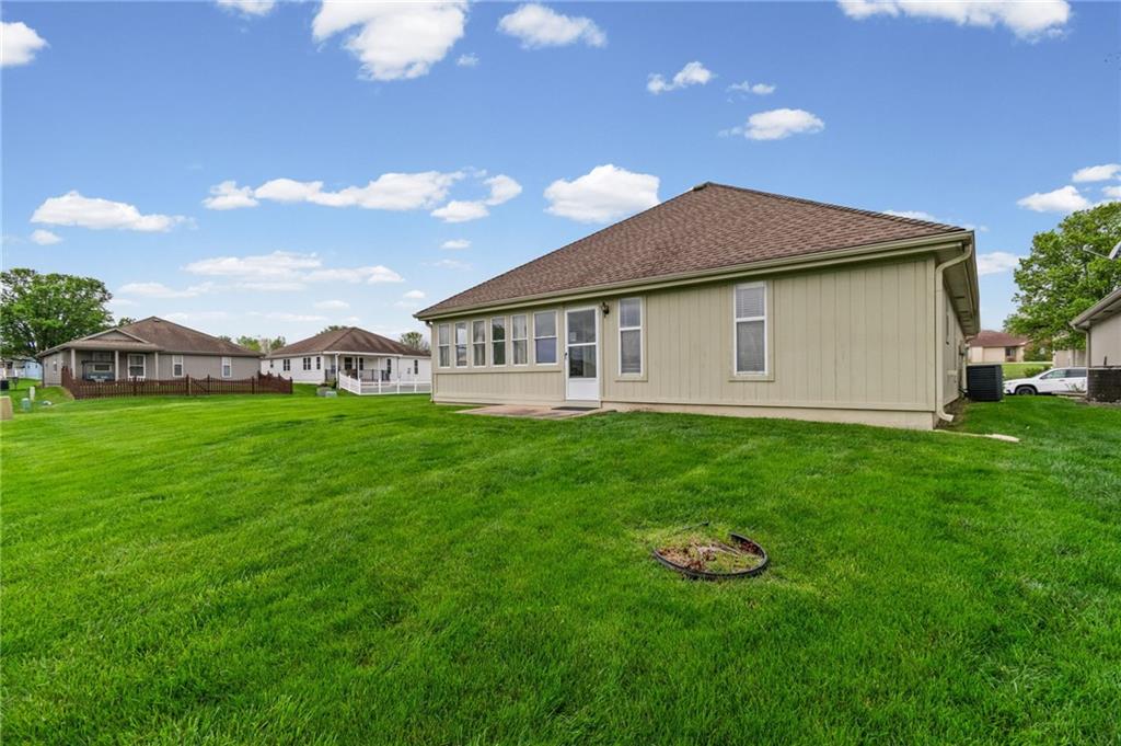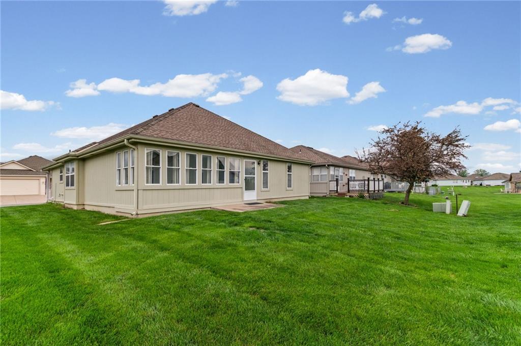 Welcome to this stunning one-level home in the desirable Morningview subdivision in Raymore! Situated on one of the largest lots in the neighborhood, this spacious corner property backs directly to the clubhouse, offering both privacy and convenience. Step inside to experience true one-level living at its finest. The home features solid wood plank flooring throughout the main living areas and ceramic tile in the kitchen and bathrooms. The kitchen is beautifully appointed with granite countertops, and all appliances stay — making this home truly move-in ready. ALL NEW INTERIOR PAINT. THE YELLOW IN PICTURES IS GONE AND A NEUTRAL COLOR HAS BEEN PAINTED. Both bedrooms offer generous space and large walk-in closets, while the two full bathrooms provide comfort and functionality. Enjoy relaxing mornings or peaceful evenings in the sunroom just off the back of the home. With its oversized lot, premium location, and thoughtful finishes, this property is a rare find in Morningview. All measurements to be verified by buying agent.