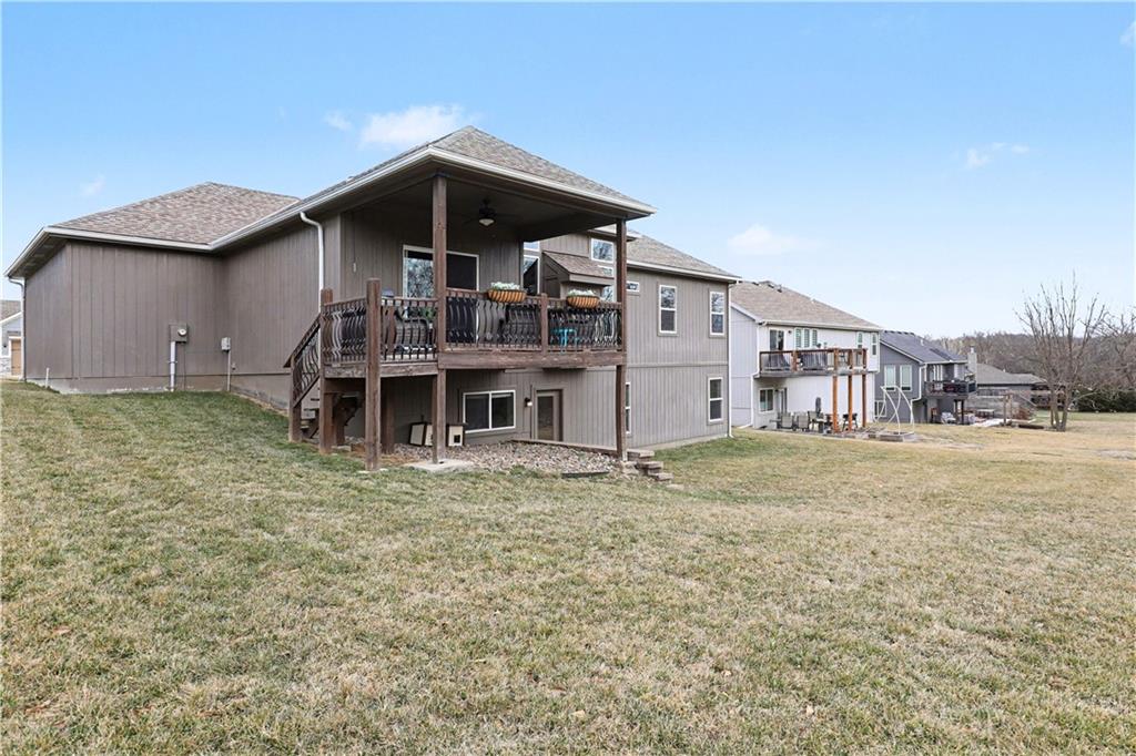 Beautifully maintained and move-in ready! This stunning home offers gorgeous hardwood floors and a light-filled open floor plan perfect for both everyday living and entertaining. The spacious living room flows seamlessly into the kitchen and dining area, creating an inviting and functional layout buyers love. You’ll appreciate the large bedrooms with generously sized closets, providing comfort, flexibility, and ample storage. The primary suite offers room to truly unwind at the end of the day. NEW stair carpet leads you downstairs to family room and two additional bedrooms and full bath. Step outside to enjoy the covered deck overlooking a peaceful wooded backdrop — ideal for morning coffee, evening relaxation, or hosting friends while enjoying added privacy. The front of the home is landscaped with gorgeous and easy care perennial flowers. The lawn was aerated this Fall and over-seeded ready for the Spring! This home offers TONS of storage from the unfinished basement area to the 22' third bay garage. This home delivers space, functionality, and scenic views — all in a desirable Lone Jack location and ONLY 17 minutes from downtown Lee's Summit.