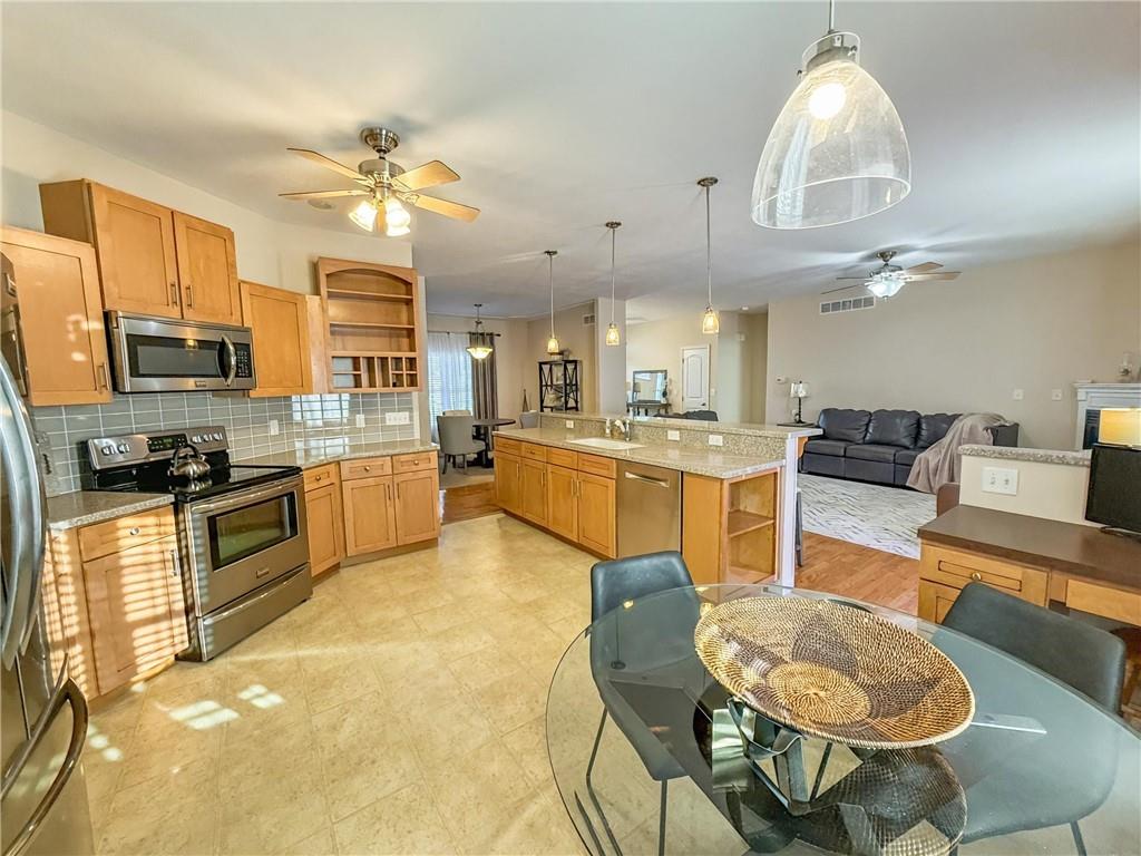 Welcome to refined comfort and timeless design in one of Maryville’s most desirable neighborhoods. Built in 2005 and offering over 1,800 square feet on a generous 0.39-acre lot, this beautifully maintained brick home delivers the perfect balance of warmth, function, and space. Step into an inviting foyer with rich hardwood floors that lead to a stunning formal dining room — ideal for hosting holidays, dinner parties, or everyday gatherings. The heart of the home is the lovely kitchen featuring abundant cabinetry, ample prep space, stainless appliances, and a walk-in pantry that buyers will absolutely love. Designed for both cooking and connection, it flows seamlessly into the spacious living room anchored by a cozy fireplace and filled with natural light. Convenience is key with main floor laundry and an attached 2-car garage. The private primary suite is truly a retreat — complete with its own fireplace, double vanity, and a large walk-in closet that offers exceptional storage. Secondary bedrooms are generously sized and each features its own walk-in closet — a rare and valuable detail. The full basement provides endless possibilities — finish it to expand your living space or keep it as abundant storage. Situated in the Southdale Addition and within the Maryville R-II School District, this home offers a wonderful neighborhood setting close to schools, parks, and everyday amenities. This is the kind of home that feels right the moment you walk in