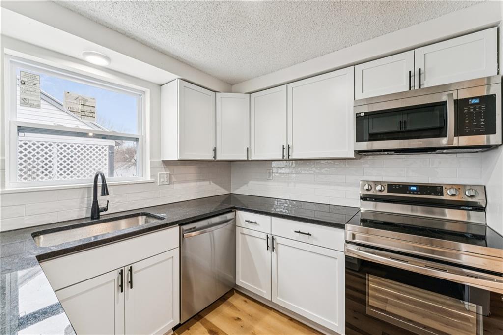 Beautifully updated townhome with a timeless contemporary design and bright, open feel throughout. The main level showcases light oak LVP flooring, sleek black hardware and lighting, and a slate-tiled electric fireplace that anchors the living space. The fully renovated kitchen features brand-new cabinetry, granite countertops, a classic subway tile backsplash, and stainless steel appliances. Upstairs, spacious bedrooms with vaulted ceilings continue the light and airy aesthetic, while the updated main bathroom offers new tile floors and surrounds, a stylish vanity, and modern fixtures. The finished basement provides a versatile bonus room perfect for a home office, rec room, or non-conforming bedroom. In addition to the cosmetic updates, the home includes a new furnace, A/C unit, water heater, and energy-efficient windows. Enjoy maintenance-free living with access to a pool, park space, and common areas; All the perks of homeownership without the hassle.