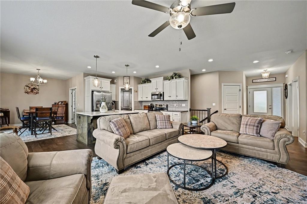 The covered front porch welcomes you home and invites you to slow down while sipping your morning coffee or enjoying a quiet evening sunset. Step inside and you’ll find a newer build designed for both everyday living and easy entertaining. The open-concept great room feels bright and welcoming, with a stone corner fireplace and a stunning quartz island that anchors the kitchen as its natural gathering place. A spacious corner walk-in pantry keeps everything tucked neatly away, while thoughtful finishes elevate the space from functional to beautiful. A smart and versatile layout elevates this home above the typical. The primary suite, laundry room, guest bedroom, and a dedicated office—offset with French doors—are all conveniently located on the main level, creating a floor plan that adapts seamlessly to work, rest, and hosting. Throughout the home, granite countertops, thoughtfully selected tile, and engineered hardwood flooring add layers of texture and timeless style. Downstairs, the family room and expanded bar area create the ultimate hangout zone—perfect for game days, movie nights, or weekend gatherings. All three bedrooms on this level with walk-in closets! Walk out to the patio for fresh air and added entertaining space, while the covered back deck—with added stairs to yard—offers yet another spot to unwind. Window blinds already in place add both comfort and convenience. Tucked into a quiet subdivision, you’ll enjoy quick access to shopping and dining at Zona Rosa, nearby airport access, and countless restaurant and entertainment options. Location, layout, and lifestyle—all wrapped into one beautifully designed package in the Park Hill School District!