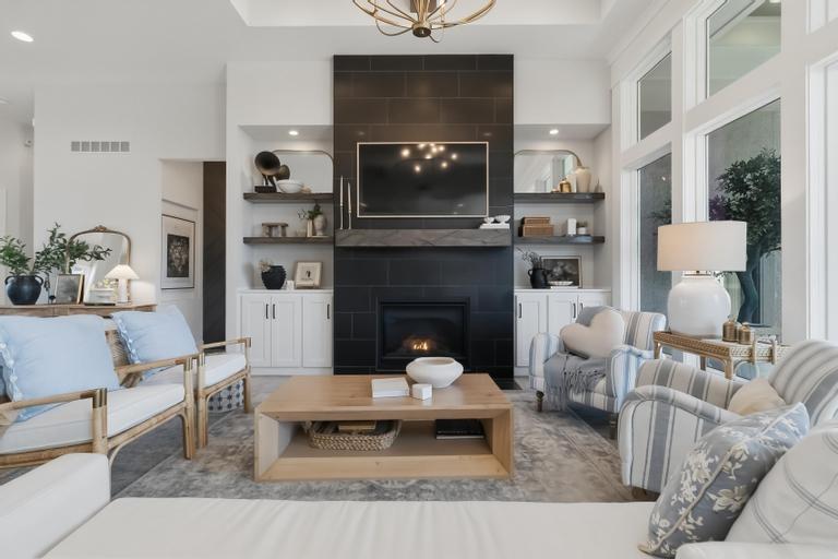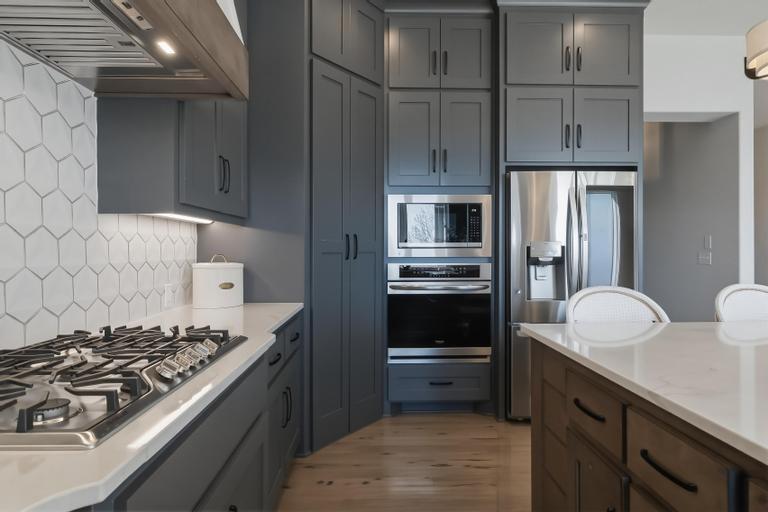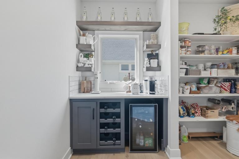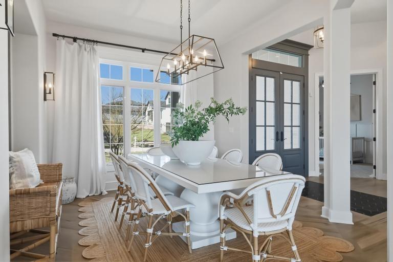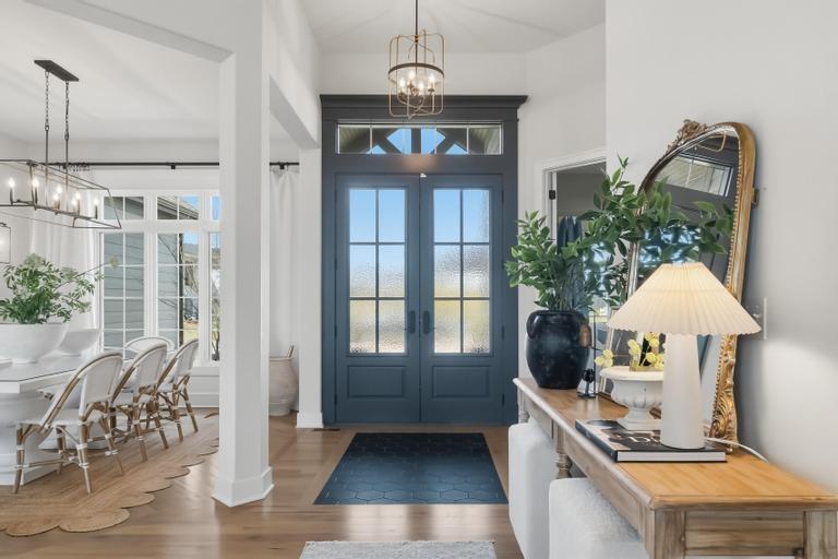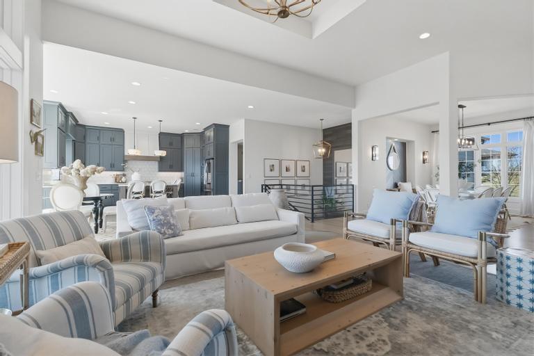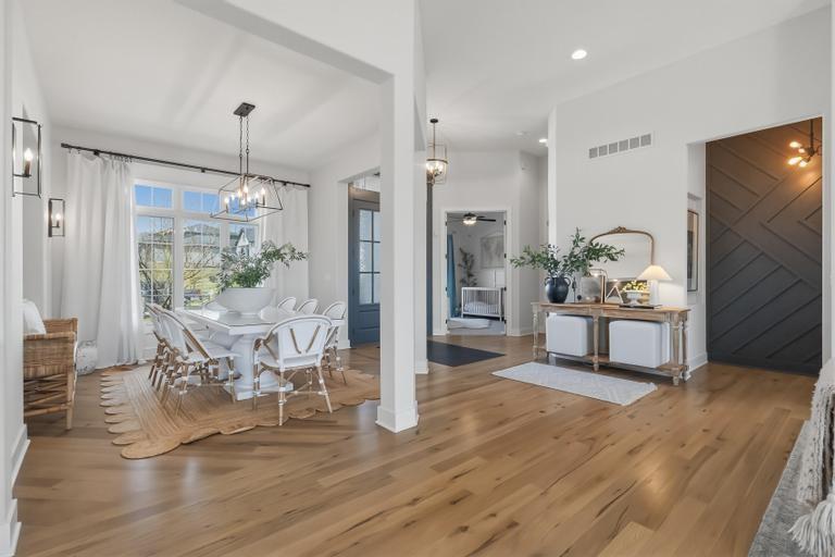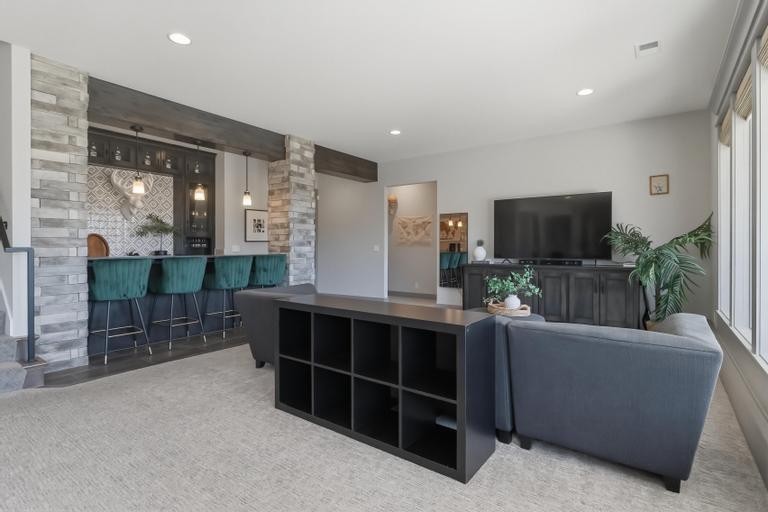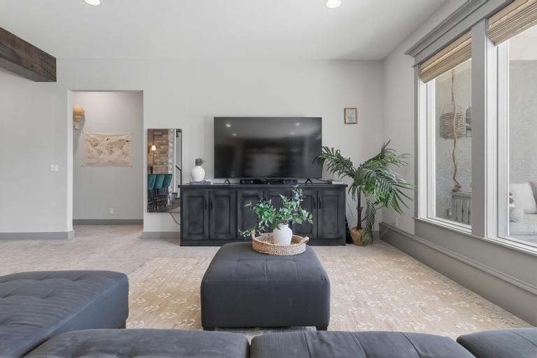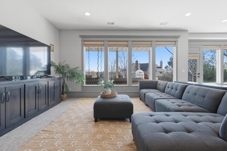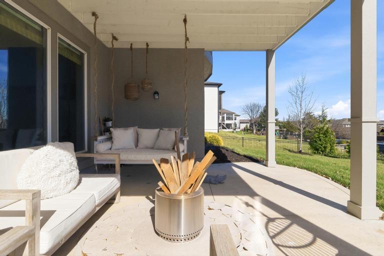 This award-winning former model by C&M Builders showcases exceptional craftsmanship, soaring ceilings, and designer finishes throughout...perfectly suited for both everyday living and effortless entertaining. The open-concept great room makes a striking impression with exposed wood beams, a fireplace flanked by custom built-ins, and a dramatic wall of windows that fills the space with natural light. Sophisticated designer lighting enhances every room. The great room flows seamlessly into the gourmet kitchen, complete with quartz countertops, a gas cooktop, beverage refrigerator, wine storage, and an expansive walk-in pantry featuring a prep area and convenient grocery door. The adjoining dining space offers an inviting setting for gatherings of any size. Thoughtful functionality continues with a built-in desk area, mudroom, and nearby laundry room. The main-level primary suite serves as a private retreat, highlighted by a stunning wainscoting accent wall, a spacious walk-in closet, and a spa-inspired bath. An additional main-floor bedroom provides flexibility for guests or a home office. The finished walkout lower level with 10 foot ceilings is designed for entertaining, offering a large family room with a wet bar, two bedrooms with private baths, and a fifth bedroom with separate entrance, ideal for guests or a nanny suite. Venture outside to the lower-level patio for seamless indoor-outdoor living. Outdoor living is equally impressive, featuring a screened-in porch and a covered deck with a cozy fireplace, all overlooking a fully fenced backyard that provides both privacy and tranquility in the highly sought-after Hills of Leawood community. Additional highlights include a suspended garage with abundant storage and future finishing potential and EV Charger. This exceptional home blends luxury, comfort, and thoughtful design in a premier location. One block from community pool and walking paths directly into Ironwoods Park.