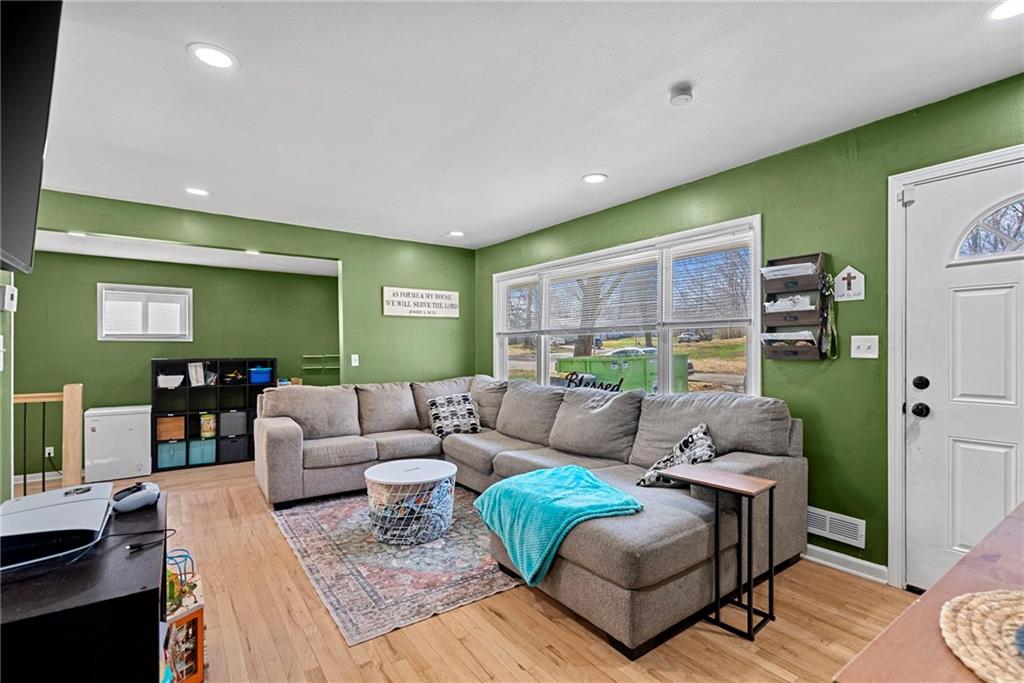 Welcome home to this bright, cheerful, and move-in ready ranch in South Kansas City! This inviting 3-bedroom, 1-bath home with a full basement offers comfort, convenience, and plenty of room to grow. Step inside to find nice wood flooring throughout and a bright, tiled, well set up kitchen with great cabinets and counter tops that makes everyday living and entertaining easy. The vinyl windows fill the home with natural light, creating a warm and welcoming atmosphere in every room. A main-level laundry area conveniently located in the converted rec room adds everyday practicality. Downstairs, the full basement provides endless possibilities whether you're dreaming of a finished living space, workshop, hobby area, or simply extra storage. You'll also appreciate the solid, dry foundation and the added security of a concrete storm room complete with lighting and electrical outlets. Out back, unwind on the deck overlooking your private fenced backyard, which backs to peaceful green space perfect for relaxing summer evenings, pets, or gatherings with friends and family. With easy highway access, commuting around Kansas City is a breeze. Plus, enjoy peace of mind with a roof and furnace that are just over a year old! This home truly offers comfort, charm, and room to make it your own. Schedule your showing today!