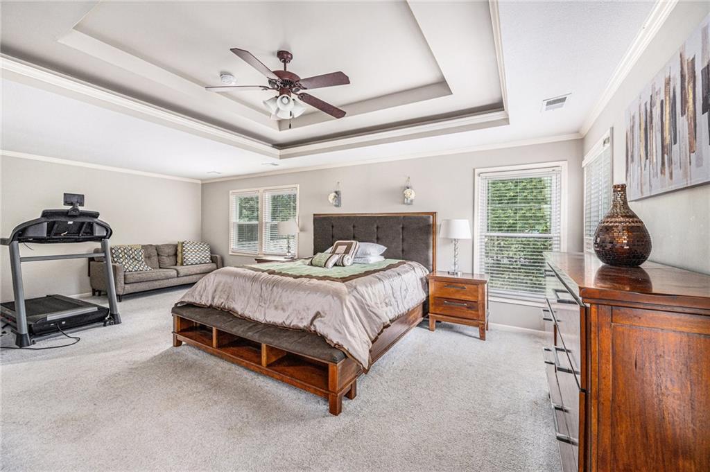 Welcome home to this expansive two-story home with the perfect blend of comfort and luxury. The main floor is equipped with a huge kitchen with plenty of storage, breakfast area, and hearth room, which make entertaining in this space a breeze. The formal dining room, office, and living room on this floor give space for everyone. Enjoy the warmth and ambience of fireplaces in both the hearth room and living room. Upstairs, you will find an incredibly enormous primary bedroom with a cozy sitting area. The ensuite bathroom is complete with dual vanity, jetted tub, and separate shower, as well as a closet big enough to hold even the largest of wardrobes. Three more generously sized bedrooms, all with attached bathrooms, round out the level. In the basement, you will find a large open area with a kitchen-style bar, plenty of counter space, and storage, great for use as a hang-out area with media, gaming tables, or easily expanded for additional living space, guest rooms, or a home office. The private backyard includes a large deck. To allow the next owner to personalize the home, the seller is offering a $5,000 flooring allowance with an acceptable offer. This home is a must see.