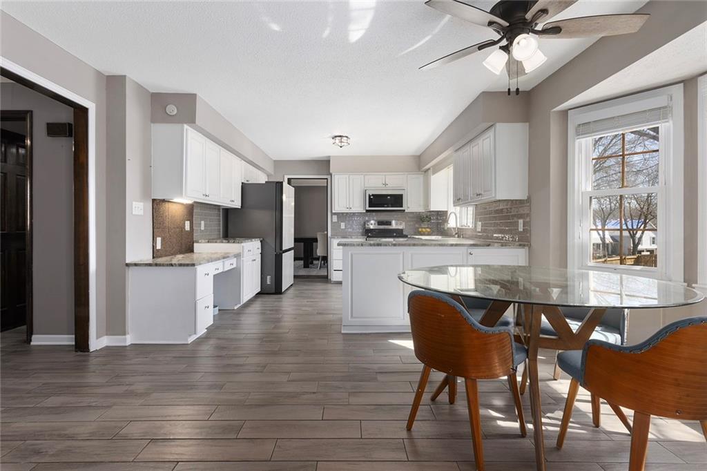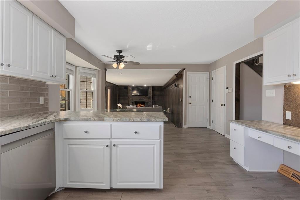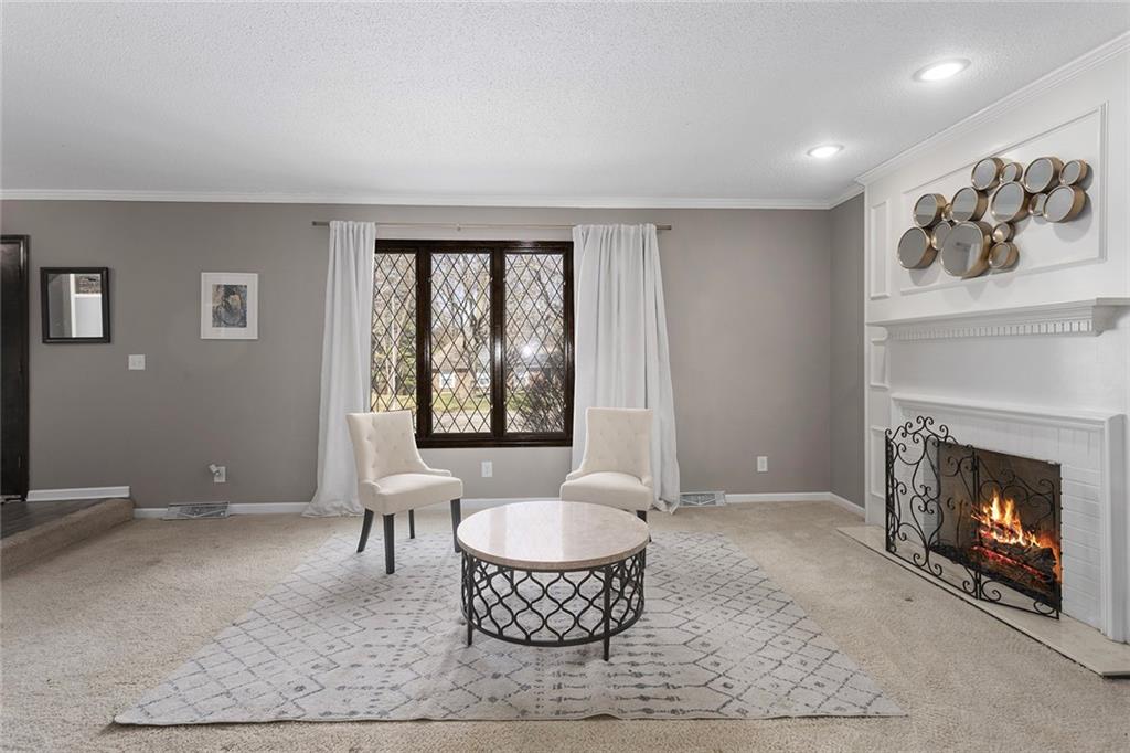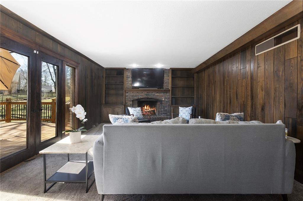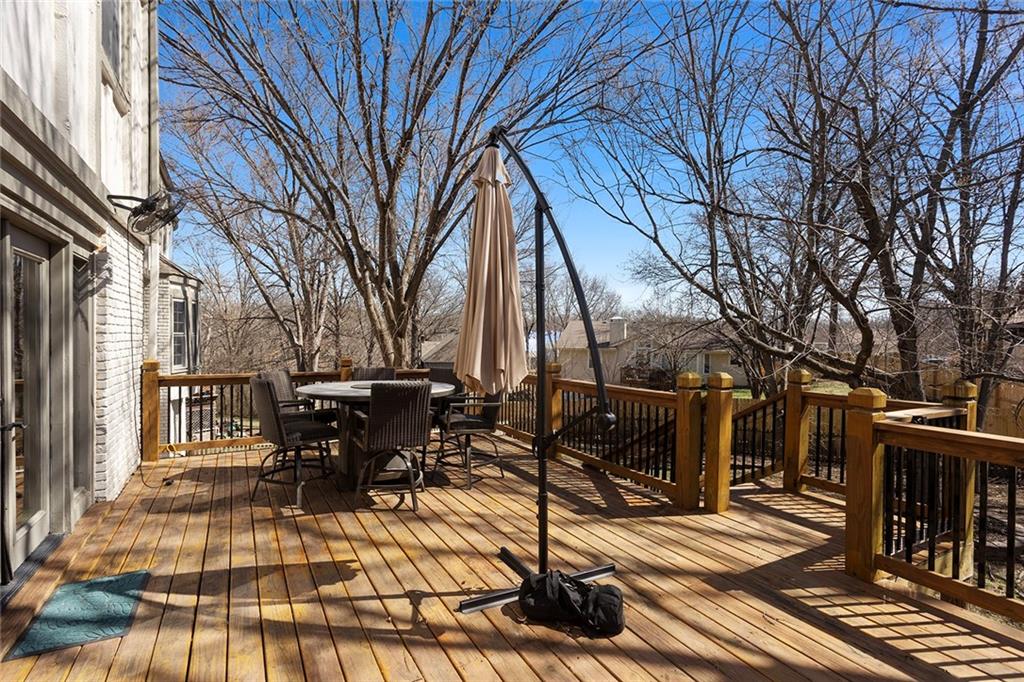 Charming Tudor with classic character and functional living spaces. Formal Living Room features a dramatic fireplace, abundant natural light, and crown molding. Spacious Formal Dining Room flows from the kitchen — ideal for entertaining. Hearth Room with brick fireplace and built-ins opens to a large deck overlooking the fully fenced yard. Luxury Primary Suite includes fireplace, double vanity, and generous storage. Finished walk-out basement offers a wet bar, fourth fireplace, and half bath. Located on a cul-de-sac in the coveted Staley/NKC School District in a market where homes in this region continue to hold value and see modest appreciation.