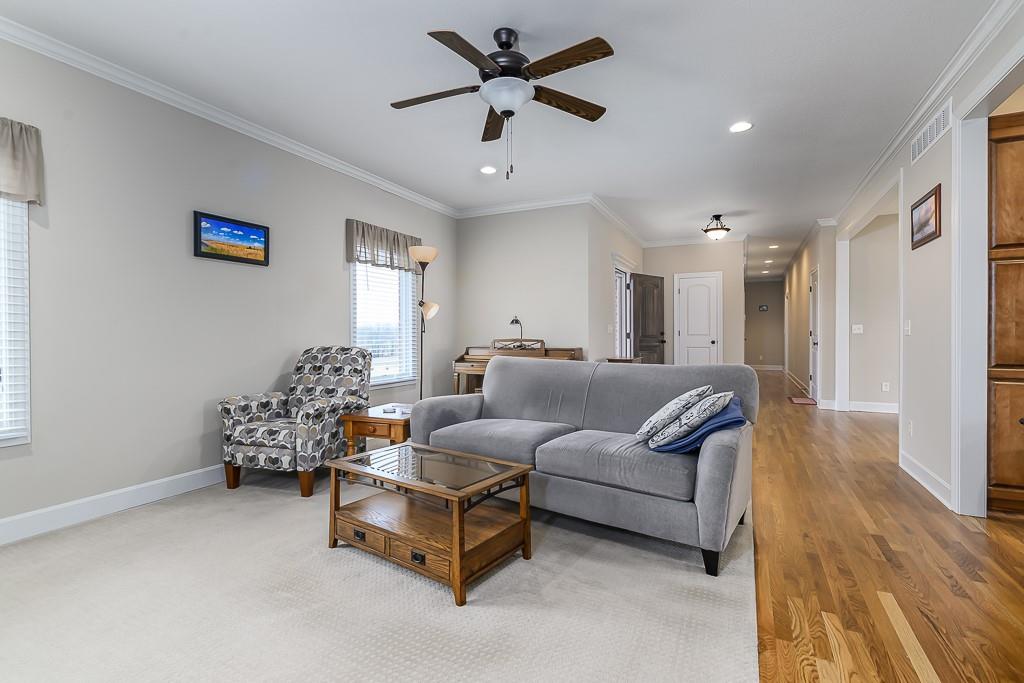 IMMACULATE 3-BED 2-BATH ALL BRICK RANCH ON 6 ACRES WITH UNFINISHED BASEMENT AND EXTRA GARAGE SPACE! This move-in ready country home features hardwood floors in the kitchen and dining room, a beautiful kitchen with quartz counters, and a large living room with upgraded carpet throughout the main living areas. The main-level laundry room adds everyday convenience. The primary bedroom suite offers his-and-her walk-in closets and a private bath with double vanities and a large walk-in shower. The full basement is unfinished but already stubbed for a full bath, giving you room to expand. Outside, you’ll appreciate the detached 20x25 garage for extra storage or workspace, all-brick construction, paved roads, and natural gas service. Both the peaceful 6-acre setting and the easy access to highways and the city make this property a great fit for buyers who want country living without giving up convenience.
