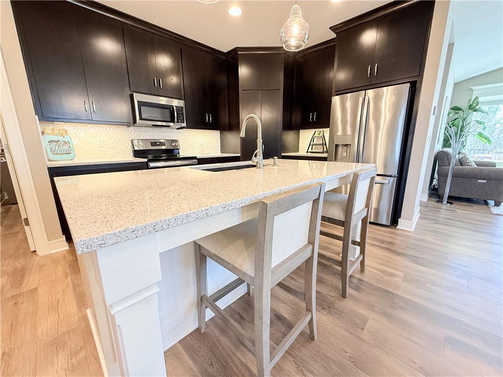 Nestled on just shy of 1/3 acre and backing to peaceful greenspace, this beautifully maintained five-year-old home offers the perfect blend of comfort, style, and privacy. Enjoy serene views year-round from the stunning covered composite deck or open the 8x8 sliding doors to experience an incredible indoor/outdoor feel. This space is ideal for morning coffee, evening gatherings, or simply relaxing while taking in the natural surroundings. Inside, you’ll find a thoughtfully designed open floor plan filled with natural light and modern finishes. The spacious main living area flows seamlessly into the kitchen and dining spaces, creating an inviting atmosphere for both everyday living and entertaining. The kitchen features quartz countertops and a large pantry for abundant storage and effortless organization. The primary suite is conveniently located on the main level, offering a private retreat complete with a well-appointed ensuite bath with large, zero-entry shower and a generous built-in dresser and storage solutions. Adding to the home’s smart layout, the laundry area is perfectly positioned just off the primary suite for ultimate convenience. With its expansive lot, beautiful greenspace backdrop, and carefully curated features throughout, this home combines newer construction peace of mind with timeless design and everyday functionality. A rare opportunity to enjoy space, privacy, and modern living all in one exceptional property.
