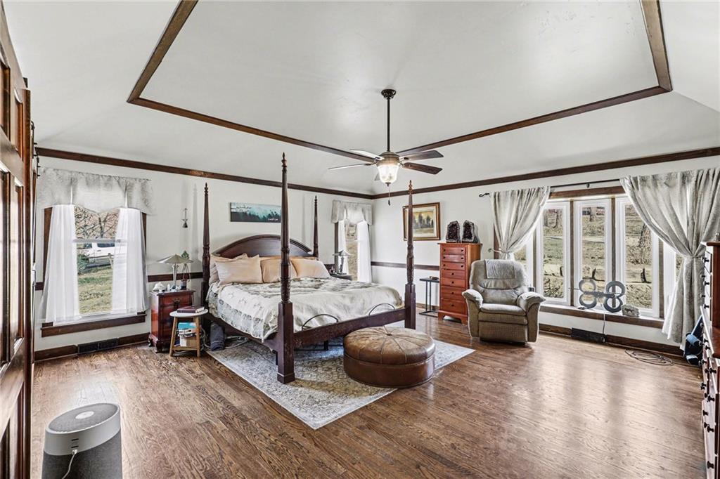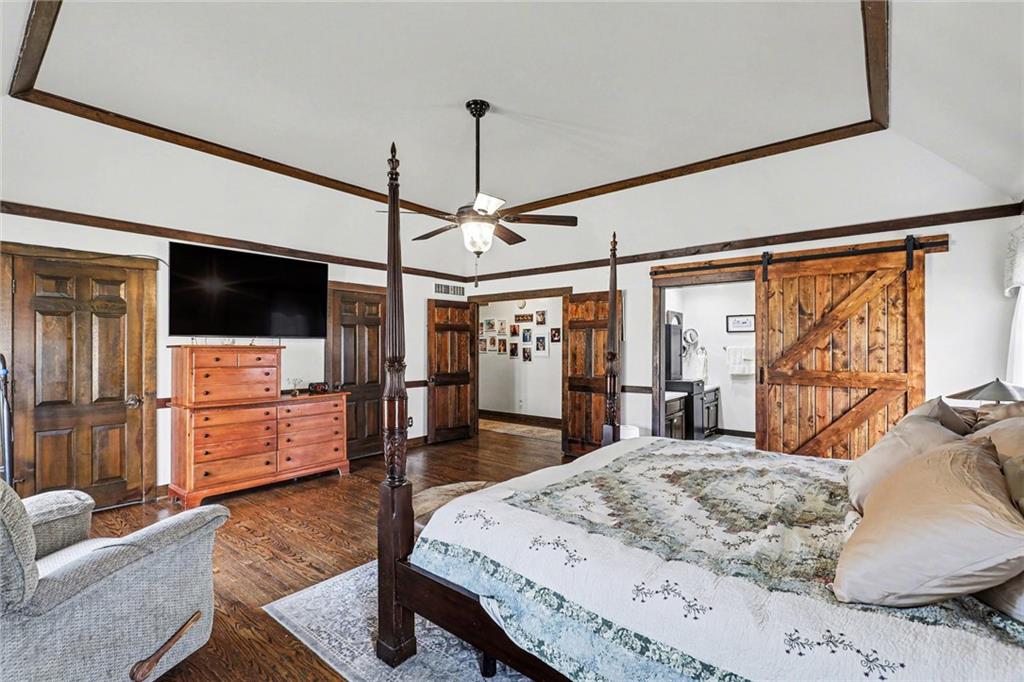 This charming, storybook home near the golf course is nestled on just over an acre with beautiful wooded views, offering character, space, and inviting farmhouse touches throughout. As you walk through the front door, you are greeted with original wood floors, open living spaces, and a gorgeous see through brick fireplace with a wood burning insert as the focal point of the living room. The dining room flows seamlessly from the living area and shares the two sided fireplace, while the spacious kitchen features granite countertops, a large pantry, and cottage inspired farmhouse charm. The primary bedroom is a true retreat with a bow window, hardwood floors, and an oversized walk in closet. The ensuite includes double sinks and a custom barn door. A second main level bedroom with its own bathroom, along with additional half baths, a laundry room, and a three car garage, complete the main floor. Upstairs offers two bedrooms and a full bathroom. The finished basement adds extra living space with a large recreation area, custom shuffleboard, a bedroom, full bathroom, generous storage, and a fourth garage, plus potential for a non conforming fifth bedroom or second kitchen. Outside, enjoy a spacious fenced backyard with a deck, covered gazebo, and patio, all backing to woods with golf course views. A charming fire pit with swings adds the perfect touch for relaxing or entertaining.