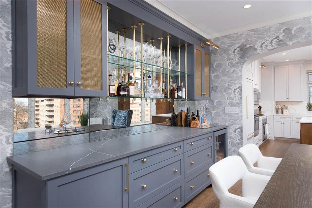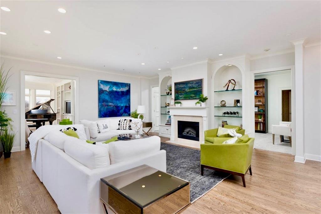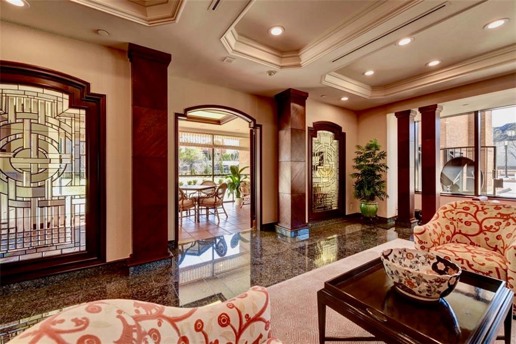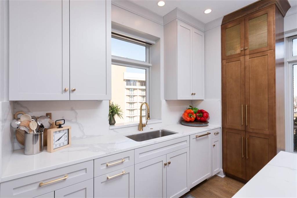 Enjoy the elevated living experience of The Alameda in this 5th floor unit. From the moment you step into the gracious entry, the home’s elevated quality and thoughtful design are immediately apparent. Wrapped along the northeast side of the building with nearly floor-to-ceiling windows, this splendid condominium is filled with natural light and showcases sparkling skyline views. Impeccable finishes are found throughout, including recently refinished hardwood floors, newly carpeted bedrooms, fresh paint, and updated lighting. Designed for both comfortable daily living and stylish entertaining, the home offers generous, well-proportioned spaces. The spacious living room is anchored by a charming fireplace, while the inviting den features substantial custom built-ins. The formal dining room includes a sophisticated built-in sideboard and beverage refrigerator that make it perfect for hosting. The well-appointed kitchen boasts a beautiful island, stainless steel gas cooktop, abundant cabinetry, and excellent workspace for cooking and gathering. The serene primary suite features a custom walk-in closet and a beautifully designed bath with double vanity and an elegant shower. The second bedroom is generously sized with a wall of closets and an adjoining bath, offering comfort and privacy for guests. Additional highlights include a laundry room, utility room, and 2 private storage rooms on the garage level. Residents enjoy exceptional service and amenities including onsite management, 24-hour doorman, and maintenance staff, along with beautifully maintained and recently refreshed community spaces such as a spacious lobby, sunroom, recently renovated gardens with grilling area, and a private pet run. This is a rare opportunity to enjoy luxury, convenience, and timeless styling at one of Kansas City’s most desirable locations, especially in this price range.