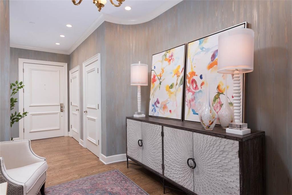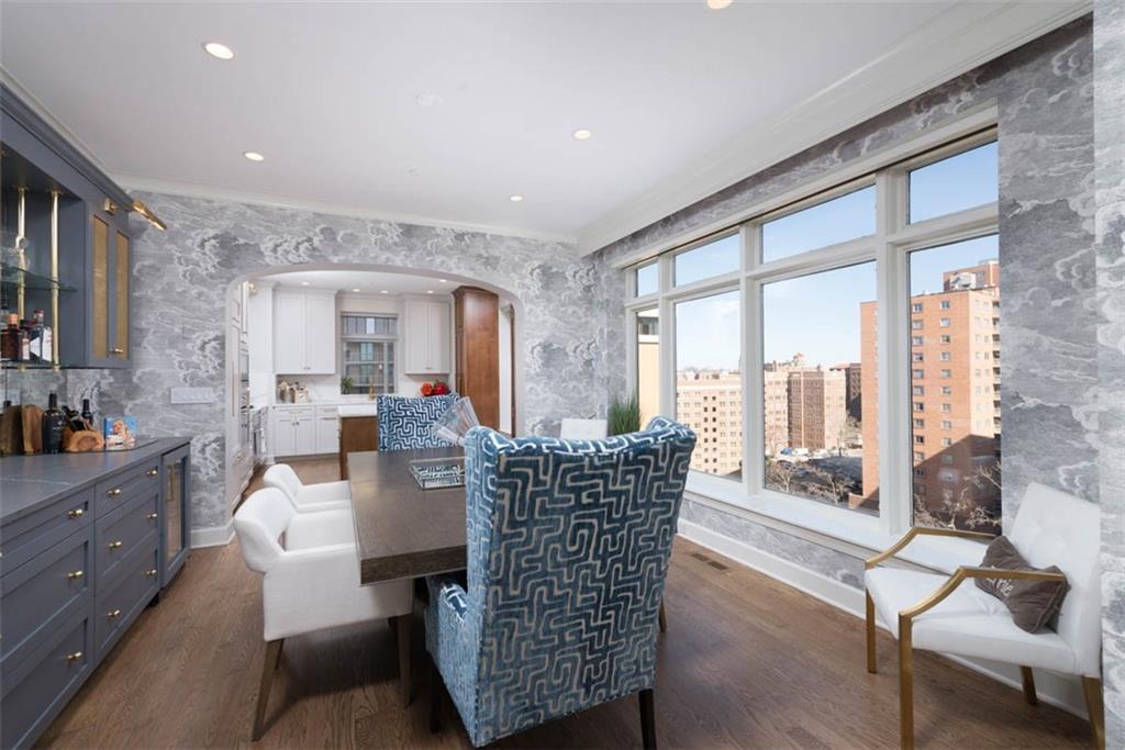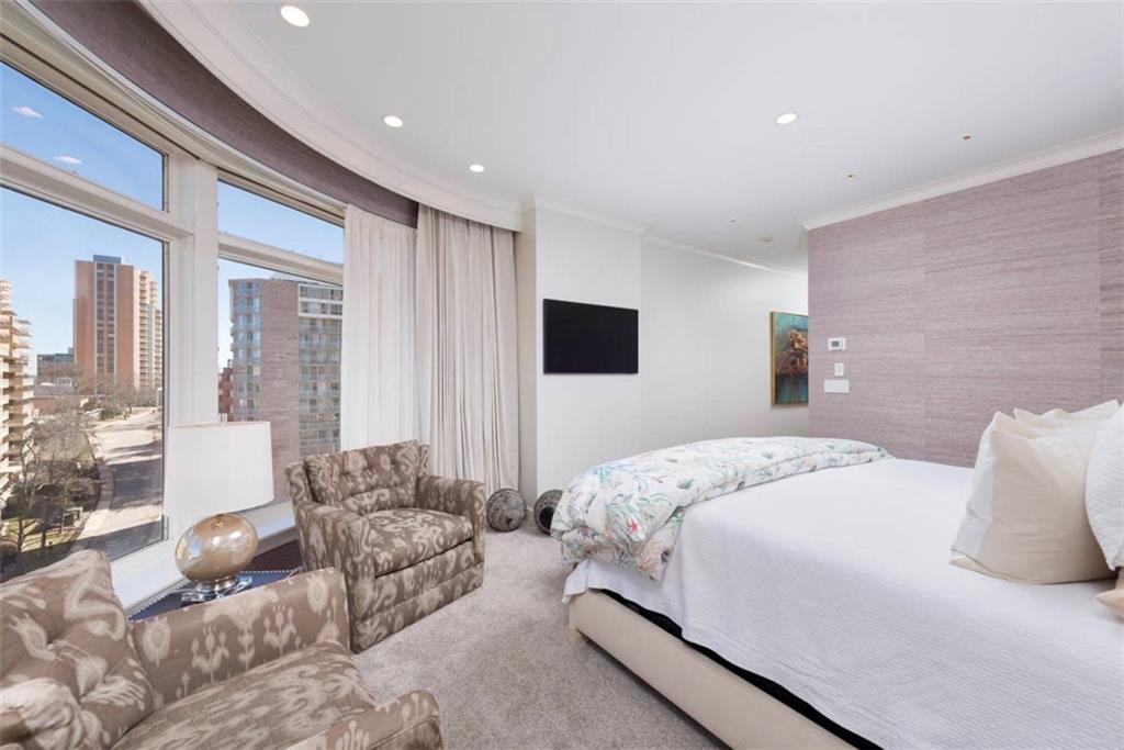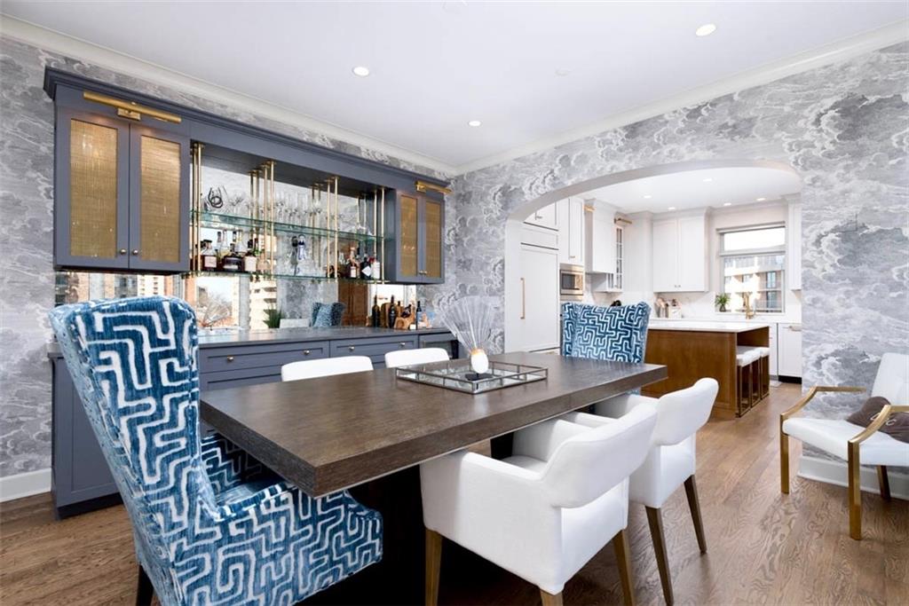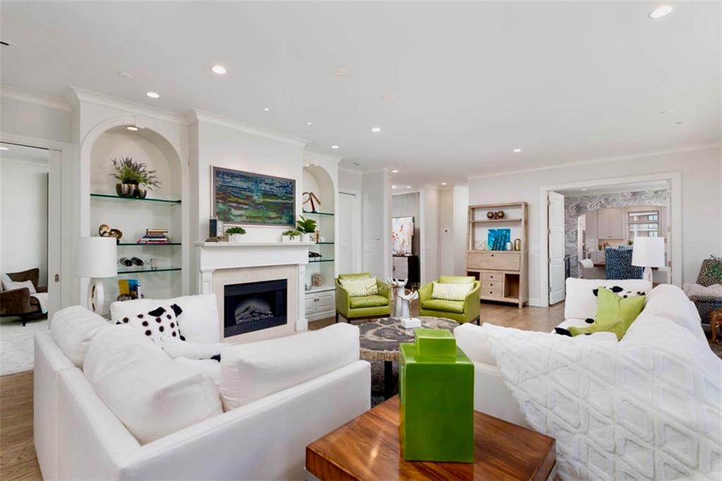 Enjoy the elevated living experience of The Alameda in this 5th floor unit. From the moment you step into the gracious entry, the home’s elevated quality and thoughtful design are immediately apparent. Wrapped along the northeast side of the building with nearly floor-to-ceiling windows, this splendid condominium is filled with natural light and showcases sparkling skyline views. Impeccable finishes are found throughout, including recently refinished hardwood floors, newly carpeted bedrooms, fresh paint, and updated lighting. Designed for both comfortable daily living and stylish entertaining, the home offers generous, well-proportioned spaces. The spacious living room is anchored by a charming fireplace, while the inviting den features substantial custom built-ins. The formal dining room includes a sophisticated built-in sideboard and beverage refrigerator that make it perfect for hosting. The well-appointed kitchen boasts a beautiful island, stainless steel gas cooktop, abundant cabinetry, and excellent workspace for cooking and gathering. The serene primary suite features a custom walk-in closet and a beautifully designed bath with double vanity and an elegant shower. The second bedroom is generously sized with a wall of closets and an adjoining bath, offering comfort and privacy for guests. Additional highlights include a laundry room, utility room, and 2 private storage rooms on the garage level. Residents enjoy exceptional service and amenities including onsite management, 24-hour doorman, and maintenance staff, along with beautifully maintained and recently refreshed community spaces such as a spacious lobby, sunroom, recently renovated gardens with grilling area, and a private pet run. This is a rare opportunity to enjoy luxury, convenience, and timeless styling at one of Kansas City’s most desirable locations, especially in this price range.