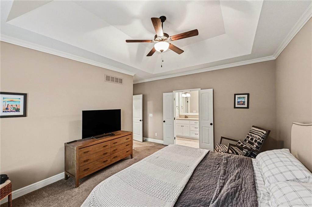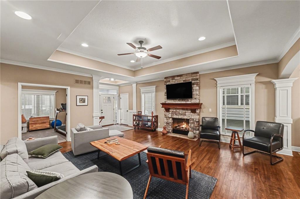 Welcome to this immaculately maintained offering timeless curb appeal and thoughtfully designed convenient living spaces. From the charming covered front porch and rear patio to the elegant stone accents, this home makes a lasting first impression before you even step inside. The main level features warm hardwood floors, soaring tray ceilings, and an inviting living room centered around a stunning stone fireplace. Large windows fill the space with natural light while the open layout flows seamlessly into the dining area and kitchen — perfect for everyday living and entertaining. The kitchen offers crisp white cabinetry, stainless steel appliances, a spacious island for gathering, and plenty of counter space for cooking and hosting. Just off the kitchen, you’ll find convenient main-level laundry with utility sink and access to the backyard. The primary suite is a peaceful retreat with a tray ceiling, generous walk-in closet, and private en-suite bath. Additional bedrooms provide comfortable space for family, guests, or a home office. Downstairs, the expansive basement offers incredible potential — ideal for future finishing, storage, exercise or creating the rec space of your dreams. With attractive upgraded landscaping, a welcoming neighborhood setting and fabulous location within walking distance of great shopping and food at the popular Lenexa City Center a location designed for both comfort and functionality, this home is ready for its next chapter. Schedule your showing today!