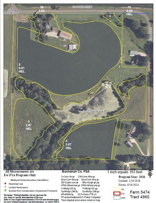 Located just 5 minutes from St. Joseph, this diversified 29± acre property in Buchanan County, MO offers a rare blend of productivity, accessibility, and scenic appeal. Situated within the highly sought after Mid Buchanan School District. This farm has great hard surface access along both the eastern and northern boundaries. Approximately 13± acres are currently in row crop production, with additional acreage in pasture. FSA mapping indicates strong potential to convert more acres to tillable ground, enhancing the farm’s income producing capacity. The property is open for the 2026 crop season, or the current owner is willing to lease back the tillable acres—providing immediate return for an investor. The farm features quality soils including Marshall, Contrary, Colo, and Knox silt loams, with an impressive NCCPI rating of 81.6, roughly 10 points above the county average. Portions of the cropland have been terraced, further supporting long term productivity and value. A standout highlight is the 4± acre stocked pond positioned near the center of the property. This beautiful water feature provides breathtaking views from multiple vantage points making this property a strong candidate for a forever home. Buyer to verify all building sizes and dimensions. Building #1: A steel frame, clear span structure measuring approximately 48' x 100'. This versatile building includes office space, partial concrete flooring (approx. 25%), and two oversized sliding doors (approx. 22'W x 13'H and 24'W x 13'H), along with additional access points—ideal for equipment storage, workshop use, or operational needs. Building #2: A traditional wood and metal hay barn measuring approximately 38' x 60', offering multiple functional areas: • 30' x 38' hay/equip. storage • 15' x 38' lean to • 15' x 38' livestock loafing/run Utilities • Electric service is available onsite. • Water service previously supplied by local water company (buyer to verify availability & connection)