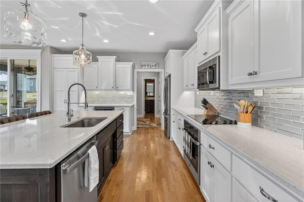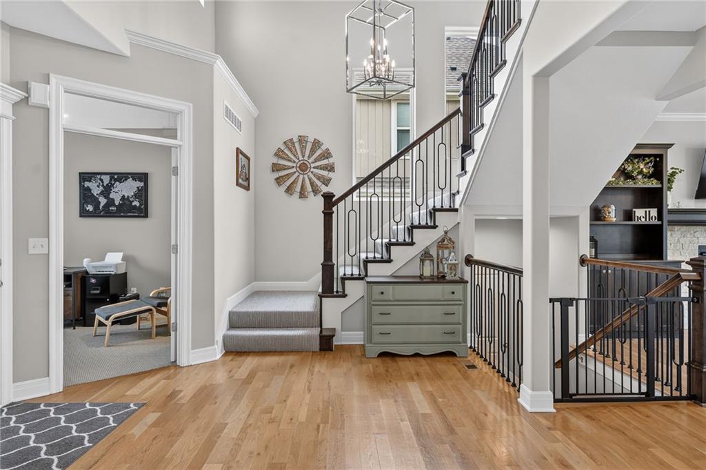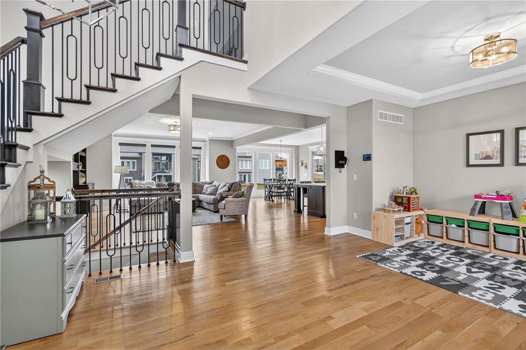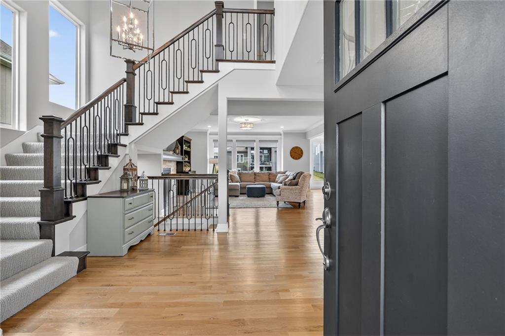 Enjoy the benefits of a newer home in a highly sought-after, recently built neighborhood without the wait of new construction. This well-maintained 2-story Rodrock “Irving” floor plan offers over 3,700 finished square feet with 4 bedrooms, 3 full and 2 half baths, a main-level office, and a finished daylight basement. The open main level features hardwood floors, a spacious great room with fireplace and built-ins, and a chef’s kitchen with quartz countertops, stainless steel appliances, a walk-in pantry, and an oversized island. Upstairs, you’ll find spacious secondary bedrooms and a luxurious primary suite with a spa-like en suite bath, along with the convenience of bedroom-level laundry. The finished lower level adds versatile living and entertaining space with room to customize to your needs. Mission Ranch community residents enjoy resort-style amenities including a pool, clubhouse, cardio center, trails, and play areas. Located just around the corner from Sunrise Point Elementary in the award-winning Blue Valley School District, with easy access to shopping, dining, and highways.