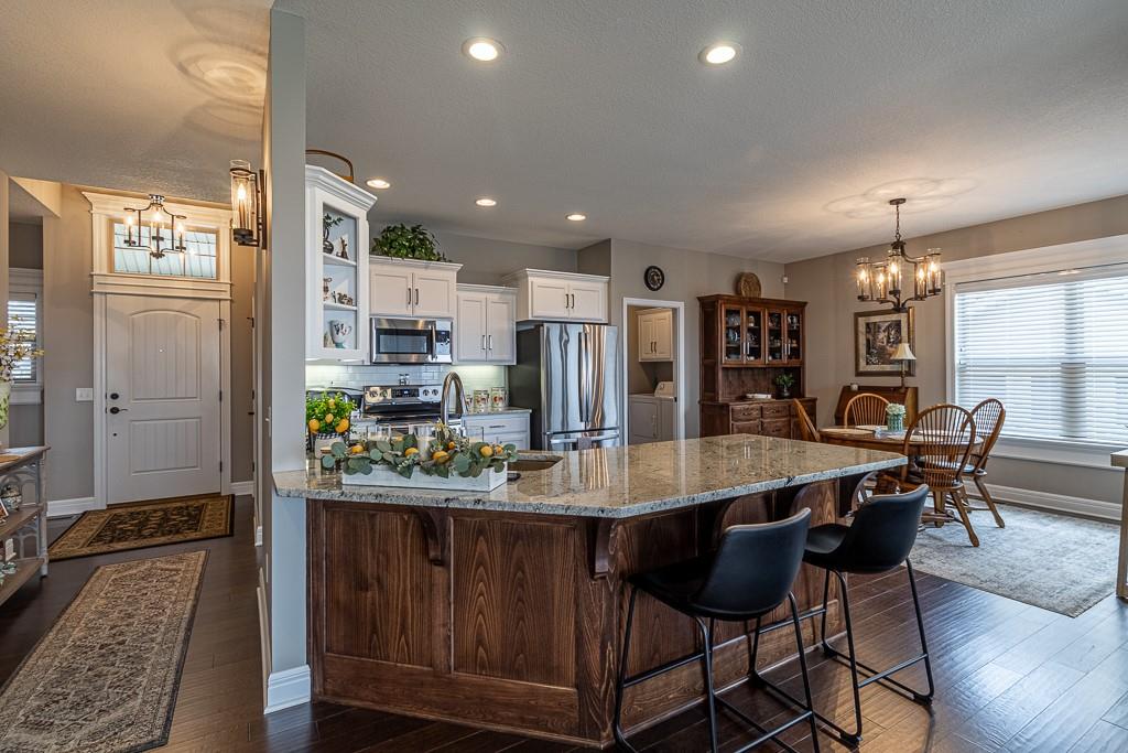 Annual HOA dues for Greystone Subdivision are $200 per year. In addition, townhome residents pay $550 quarterly, which covers lawn care, irrigation system/water & snow removal. Homeowners have access to the stocked ponds and common grounds. This beautifully maintained townhome features custom cabinetry, granite tops, wood flooring, attractive gas fireplace and screened in deck. All appliances stay including washer, dryer and near new refrigerator. Additional amenities include a 2 car attached garage, main level laundry room and full unfinished walk out basement, where there is plenty of space for hobbies, storage or future finished living area. Area rug in great room will stay and some shelving units in the basement. Quick possession available.