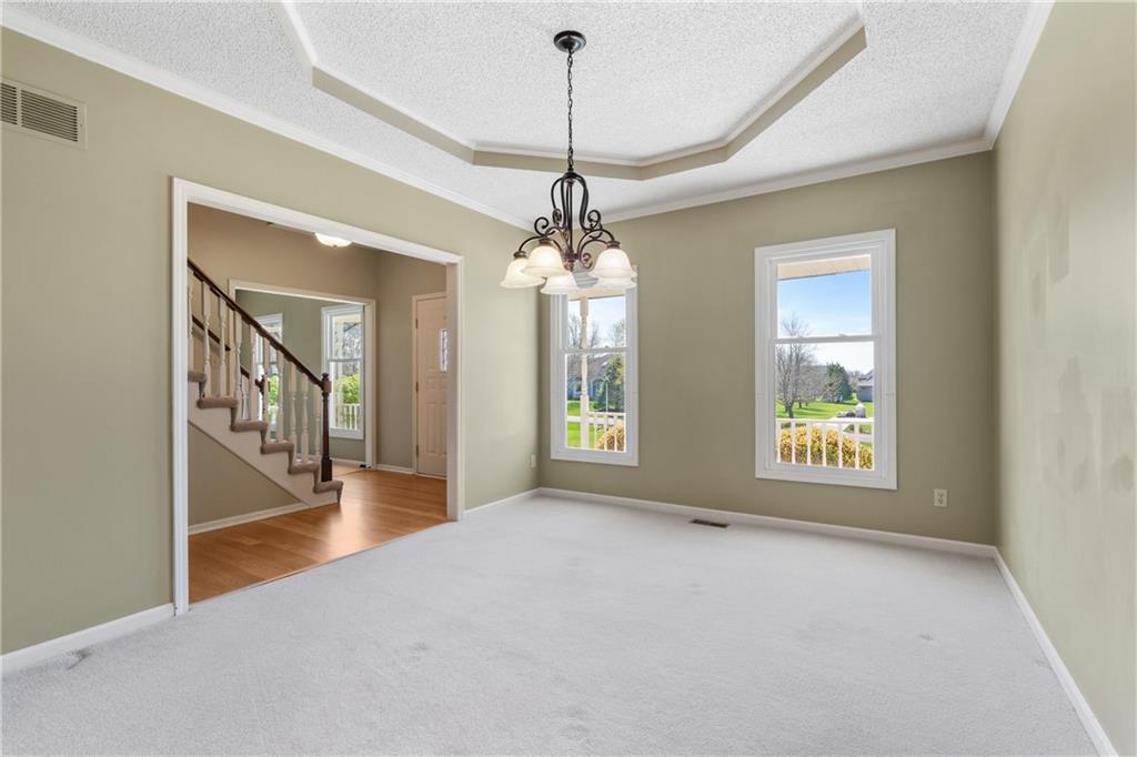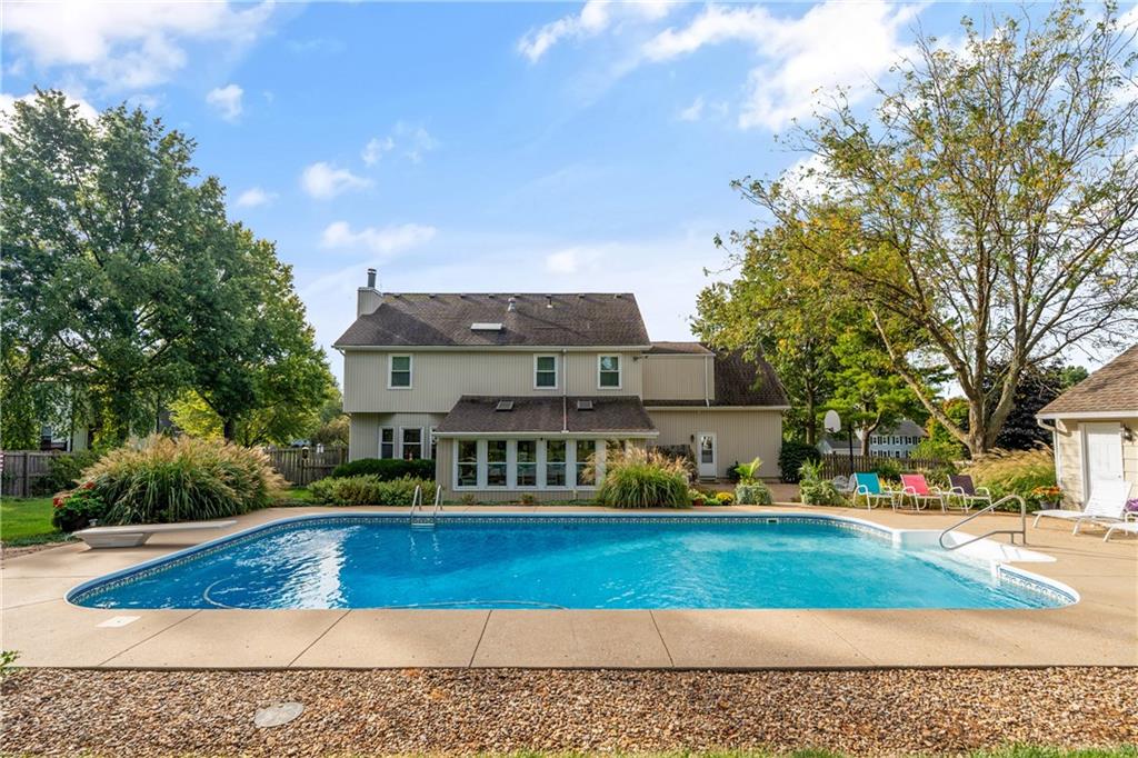 Tucked away in the desirable Harmony South neighborhood, this classic Colonial-style home offers a rare blend of space, comfort, and a peaceful one-acre setting. The main floor features a traditional layout with a formal dining room and a dedicated home office with built-ins just off the entry. The living room is warm and inviting with a bay window, brick fireplace, and custom built-ins, creating a perfect place to gather. The kitchen is designed with functionality in mind, offering abundant cabinetry, generous counter space, and granite countertops for everyday living and entertaining. Upstairs, the primary suite provides a private retreat with tray ceilings, a separate sitting area, and an ensuite bath complete with double vanities, vaulted ceilings, a soaking tub, separate shower, and skylight. Additional bedrooms are comfortably sized and offer flexibility for family or guests. The finished basement expands the living space and can easily serve as a recreation room, workout area, hobby space, or media room. A standout feature of the home is the bright all-weather porch, surrounded by windows and filled with natural light, making it the perfect spot to relax, watch the seasons change, or enjoy game days. The backyard is truly special, featuring an oversized saltwater pool, mature landscaping, fruit trees, and grapevines that produce annually. A patio extends the outdoor living space, and a convenient shed near the pool provides storage for equipment and supplies. Set in a quiet, established community known for its friendly atmosphere, this home also offers exceptional access to everything South Overland Park has to offer, including parks, shopping, healthcare, highways, and the Arboretum, along with highly regarded schools nearby. This property combines everyday comfort with a private, retreat-like setting in a location that makes daily life easy and enjoyable.