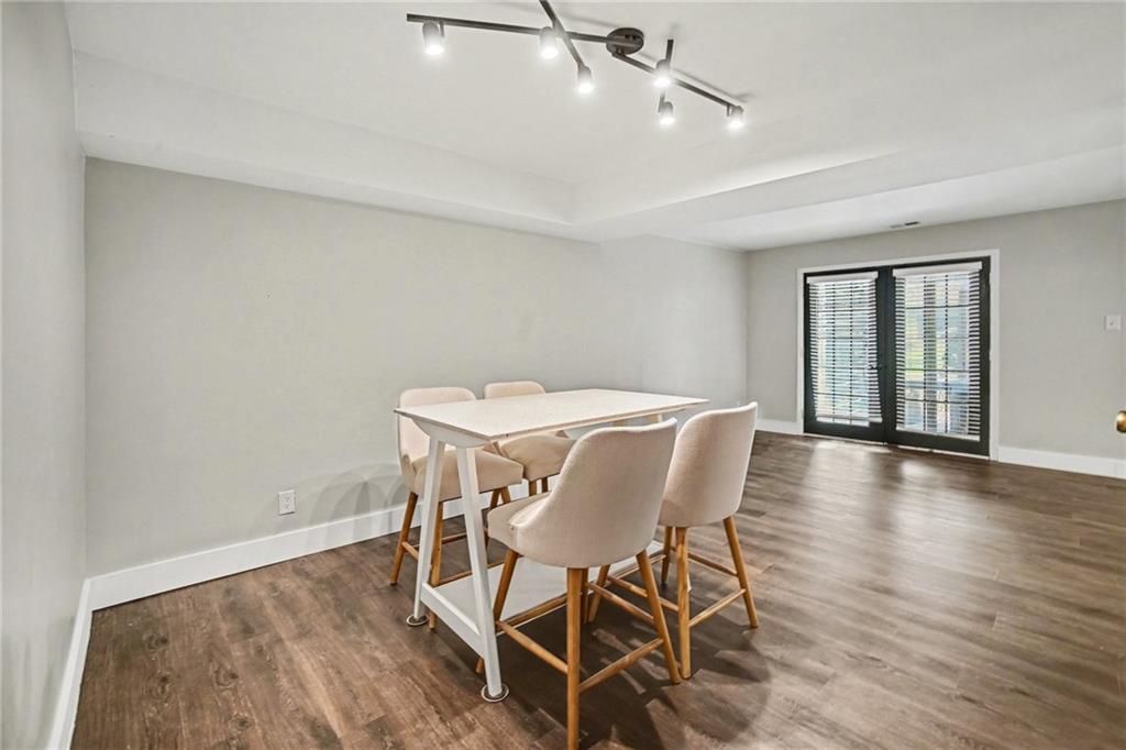 Updated townhouse with walk-out basement in the Staley High School area, located within walking distance to grocery stores, shops, and community pool. The kitchen features newer stainless steel appliances and updated flooring, with dark floors throughout the main level and upper hallway. The main level includes a spacious living room with fireplace, formal dining room, and access to a private deck. Upstairs are large bedrooms including a spacious primary suite with a bath and closet. The finished walk-out basement adds a large family room (brand new flooring) and laundry room, with access to the backyard. Great location with quick access to shopping, dining, and neighborhood amenities.