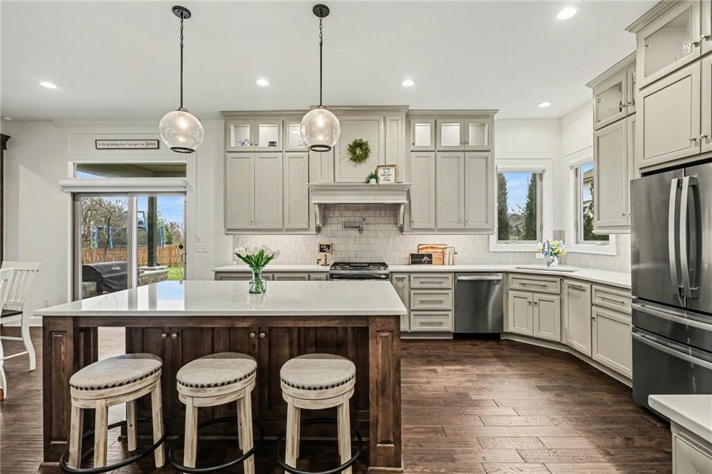 Welcome to the sought-after Makenna floor plan, designed w/ exceptional finishes, upgrades & details throughout. This custom-built, two-story home recently refreshed w/ new interior paint makes a stunning first impression w/ double iron entry doors that open to a grand foyer featuring a custom milled ceiling. Formal living room, complete w/ french doors, & dining room w/ beautiful built-ins & woodwork & living room is centered around a striking stone fireplace adding warmth and character. Kitchen is designed for everyday living and entertaining w/ premium appliances, gas range, a pasta arm, quartz countertops, lighted upper cabinets & oversized island. It flows easily into stylish mudroom + convenient powder bath + large pantry. Upstairs, the spacious primary suite w/ an oversized walk-in closet and a luxurious en-suite bath with soaker tub, double vanities and large walk-in shower. 3 additional bedrooms and two full bathrooms complete the second level. Don’t miss custom built-ins, vaulted ceilings and ceiling detail! The finished lower level provides incredible flexibility with a second living space, full kitchen, additional bedroom, office, and bathroom, making it ideal for guests or multi-generational living. The backyard is designed for entertaining, a covered patio off the kitchen features a fully-equipped outdoor kitchen with a grill, beer tap, side burner, and generous storage. A firepit, full fence and established trees and shrubs provide added privacy and create a relaxing outdoor retreat. Large 3 car garage. Upgraded carpet, stair spindles, soffit lighting on the exterior, landscape lighting, barn doors to laundry room, windows treatments already in place, smart thermostat, radon system. In the highly desirable Stonebridge Trails community, residents enjoy access to 4 neighborhood pools, walking trails, clubhouse, playground, tennis courts, & more. Home offers the perfect combination of comfort, style, & amenities. Former model home checks all the boxes!