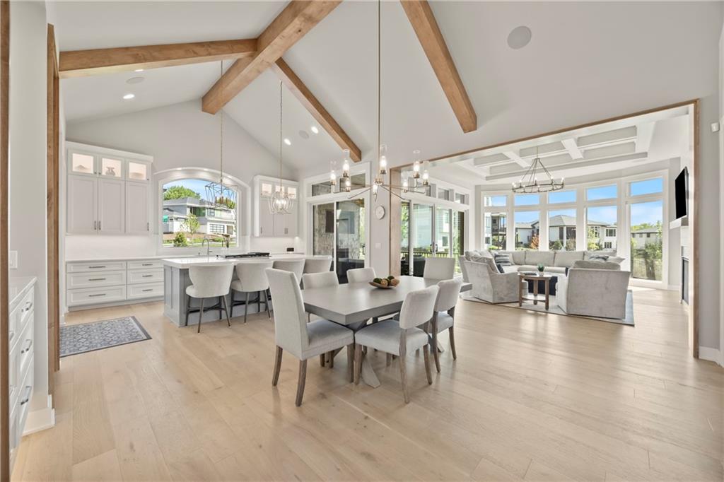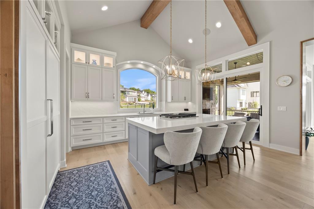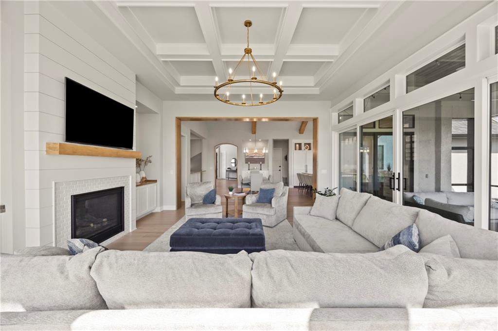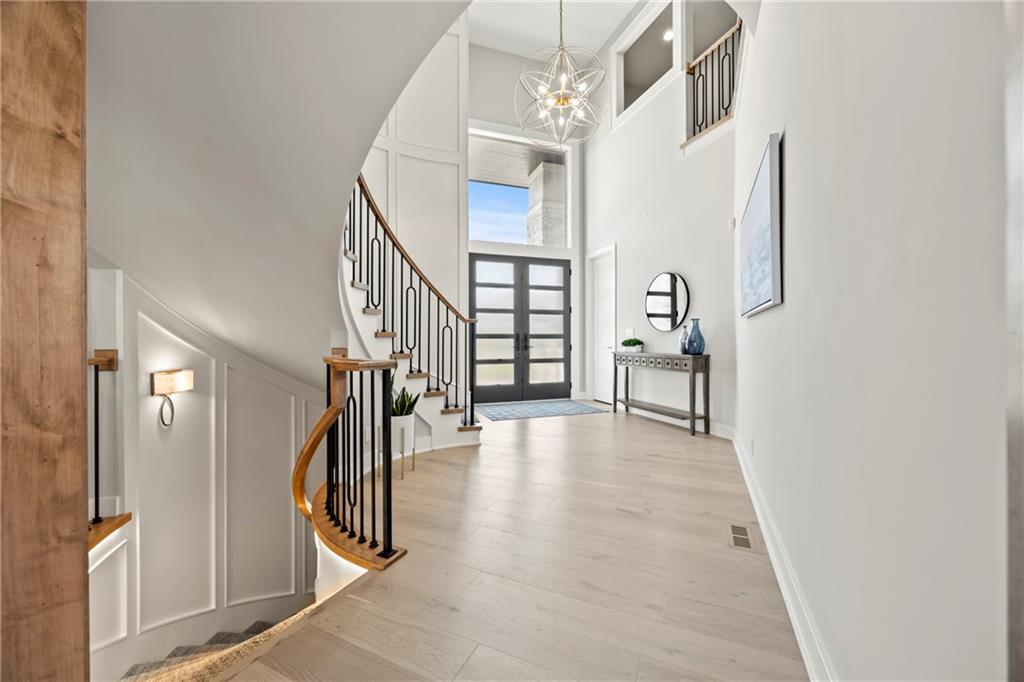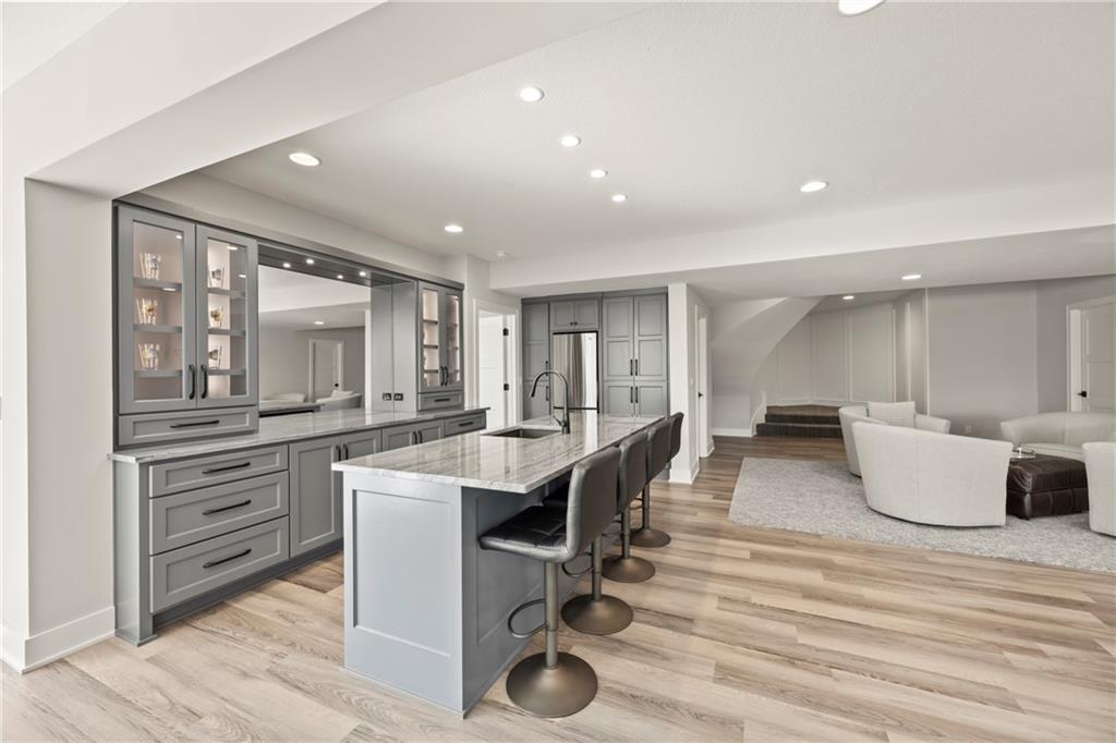 Amazing one and a half story home with a full finished walkout basement in Mills Ranch ready for quick move-in. This nearly new, 3 year old Willis Custom Built home is a stunner with a spacious vaulted main floor living space, impressive curved staircase, arched doorway to the great room, unique 2nd bar, theater room, screened in lanai sun porch, walk in double shower with freestanding tub, huge 4 car split garage with high lift doors, dog wash, pocket office, premium sound system and smart tech package. So many unexpected extras in this home around every corner. This 1.5 Story floor plan features a main floor primary suite with luxurious spa bath with with white quartz and mini tiles. Must see! Upper level offers private spaces with loft, second laundry and two premium bedrooms loaded with extra features and upgraded baths. You'll love the fully finished walkout lower level with LVT flooring, movie room, wet bar and 4th bedroom. This upscale home sits on a corner lot with a side entry four car garage and a front circle drive. Beautiful landscaped and fully fenced unique backyard allows for you to access from the main level and walkout on the side. Move right in to this amazing home located in Mills Ranch with a new neighborhood pool, and easy access to the Johnson County walking trails and quick access to Highway 69. All the luxuries of a new home are already added including premium window coverings, fenced yard, water bottle filler, built in side-by-side refrigerator and premium sound system. Why build when you can move right into this award-winning Willis Custom Home. Blue Valley School District