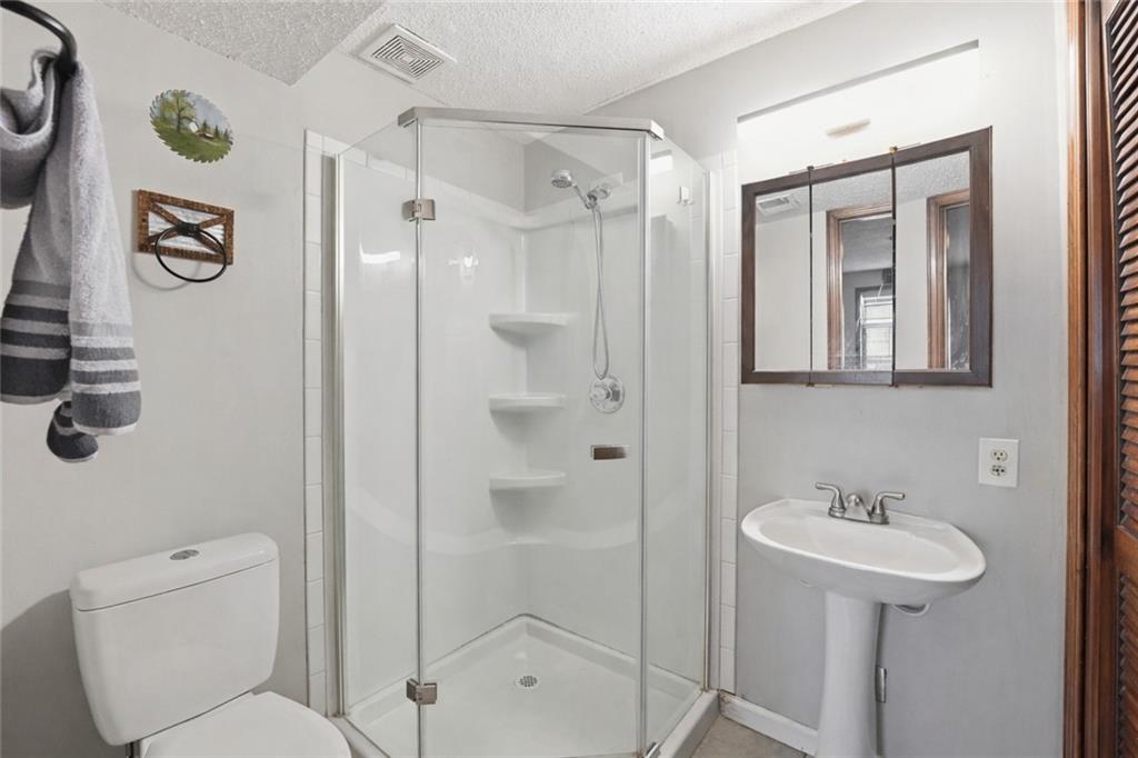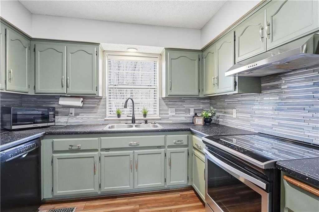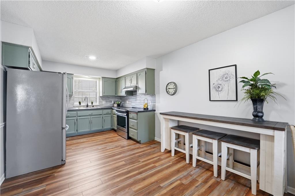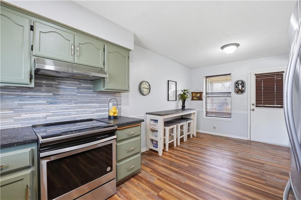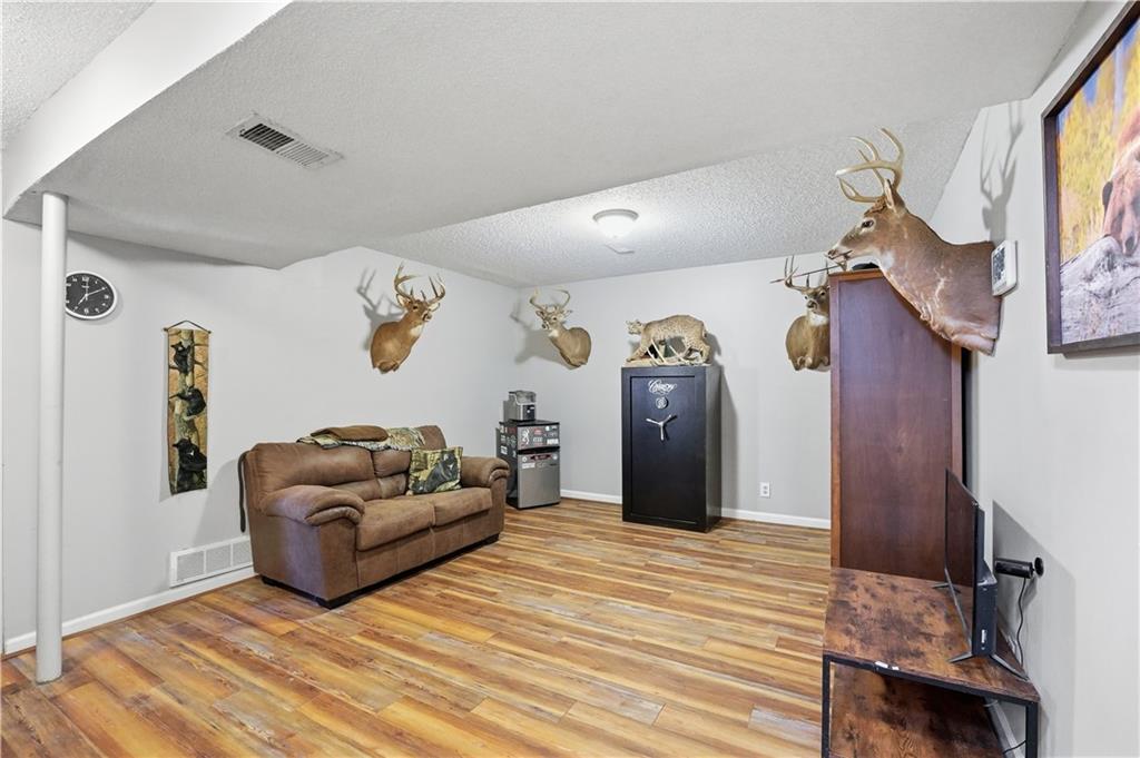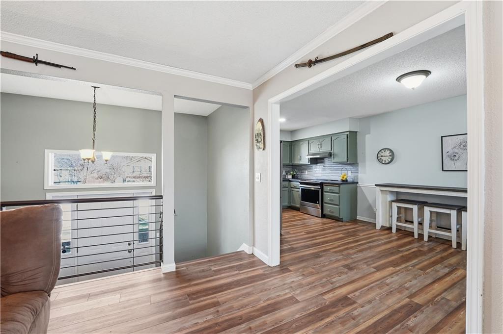 Situated on a peaceful cul-de-sac lot, this inviting split-entry home welcomes you with a spacious entryway accented by elegant iron railings. Step inside to discover laminate plank flooring throughout, adding modern style. The living room features a cozy fireplace with new electric insert, ceiling fan, and sleek iron railing that enhances the open, streamlined feel of the space. Updated eat in kitchen that walks out to a covered deck. The primary bedroom features a decorative box ceiling, ceiling fan, and a large walk-in closet, along with the convenience of an adjoining private bath. Laundry is located on the bedroom level. The finished lower level offers a spacious family room and a fourth bedroom featuring a stylish painted plank accent wall and attached bath. Large fenced backyard with covered deck and a paver patio surrounded by established trees.