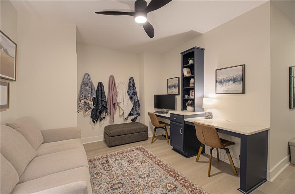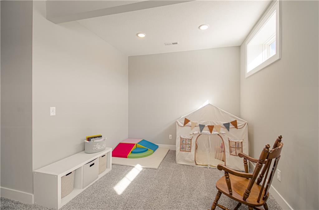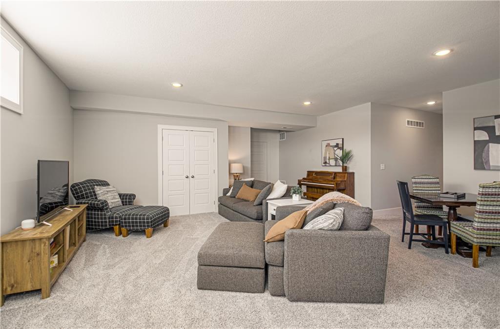 WOW! BETTER THAN NEW! Welcome to this beautifully crafted Woodland Hills APEX Reverse 1.5-Story by Prieb Homes, offering a thoughtful design & quality finishes throughout. A welcoming covered front porch sets the tone, while the north-facing covered deck provides the perfect space for year-round entertaining. Just below, enjoy the landscaped patio with a striking stone retaining wall & a fenced backyard. Inside, the open-concept plan features tall ceilings & 9' foundation walls, creating a spacious feel throughout the home. The expansive main level boasts a stunning great room featuring a stone fireplace with wood mantle & hardwood floors, flowing seamlessly into the well-appointed kitchen. Highlights include quartz countertops, a large island, a custom range hood, stainless-steel appliances & a walk-in pantry, plus an adjacent breakfast/dining area perfect for everyday living. The primary suite offers a peaceful retreat with coffered ceiling, a huge walk-in closet, dual vanities with quartz countertops & a luxurious shower with dual showerheads. A highly desirable 2nd main-level bedroom features an accent shiplap wall & access to a nearby full guest bath with a tile floor & quartz countertop. The main floor also includes a laundry room & a mud room with built-in drop zone bench & closet. The finished daylight lower level is ideal for entertaining, with abundant natural light in the large recreation room offering space for gatherings, games or hobbies. Also, 2 additional bedrooms with egress windows & walk-in closets, a full bath & a BONUS room with a HUGE walk-in closet, built-in desks with quartz countertops that works perfectly as an office or 5th non-conforming bedroom. Additional features include sprinkler, 50-gal water heater, low-E double-pane windows, tiled bath floors, main-level blinds, stunning staircase mirror, a generous unfinished LL storage room & 3 car garage. This home blends comfort, style & functionality—perfect for everyday living & entertaining.