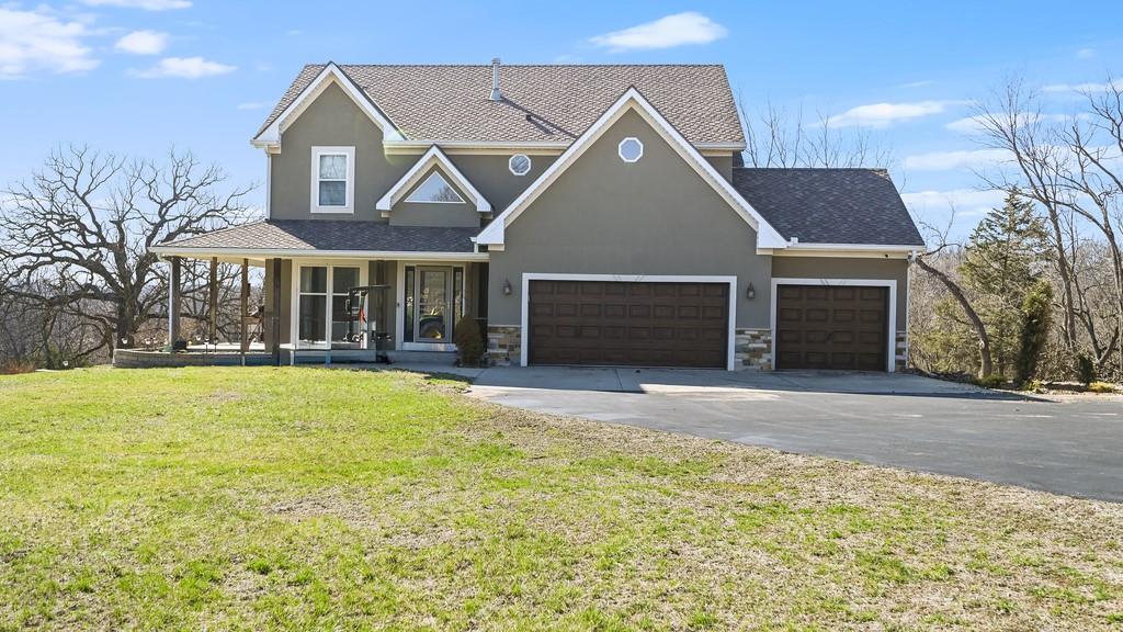 View of front of property with an attached garage, stone siding, a front yard, and driveway