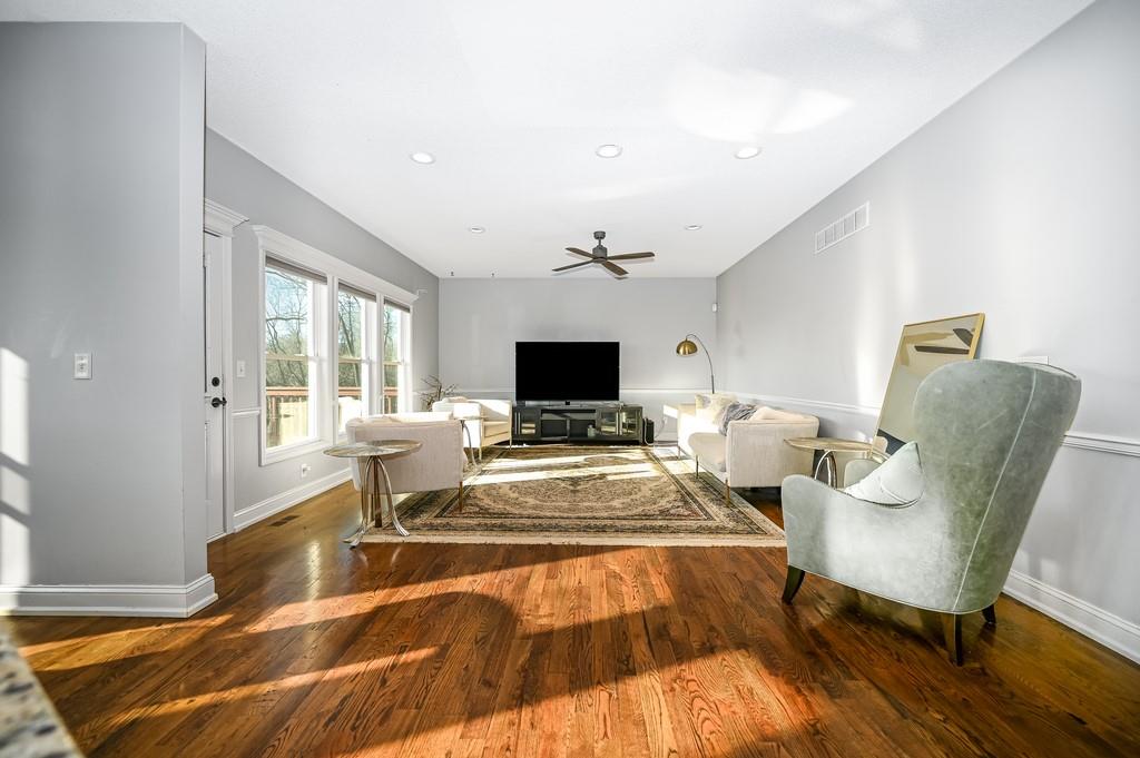 Living area featuring hardwood / wood-style floors, a ceiling fan, and recessed lighting