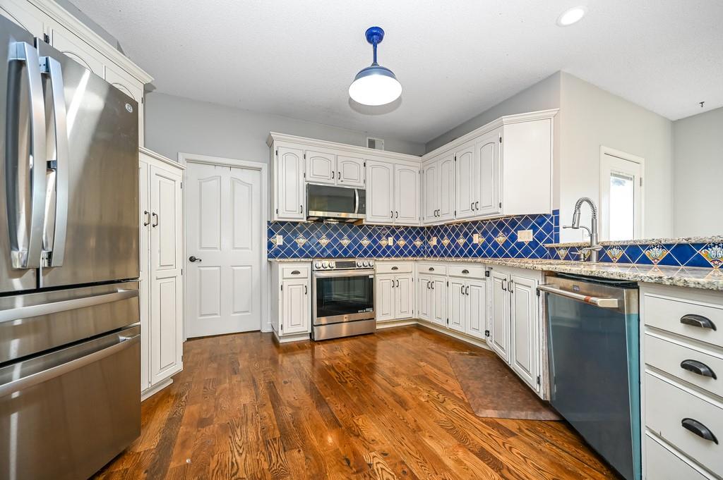 Kitchen with stainless steel appliances, dark wood-style floors, white cabinets, light stone counters, and tasteful backsplash
