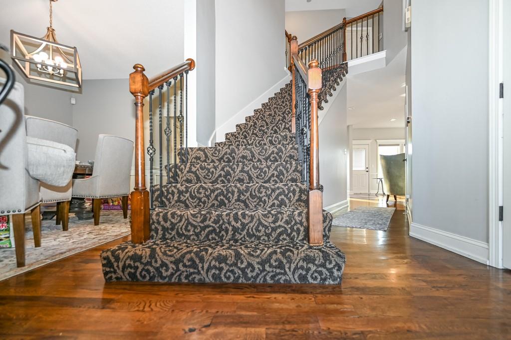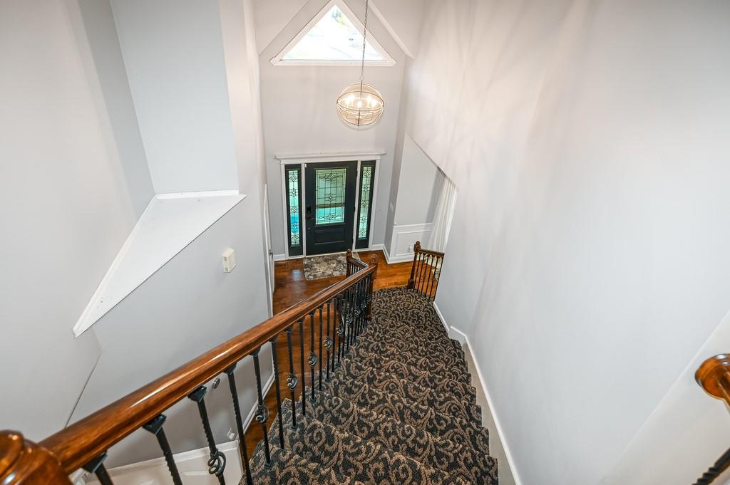 Stairs featuring a high ceiling, carpet, and hanging lights
