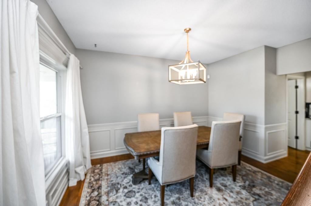 Dining area featuring a decorative wall, a wainscoted wall, hanging lights, and dark wood-style floors