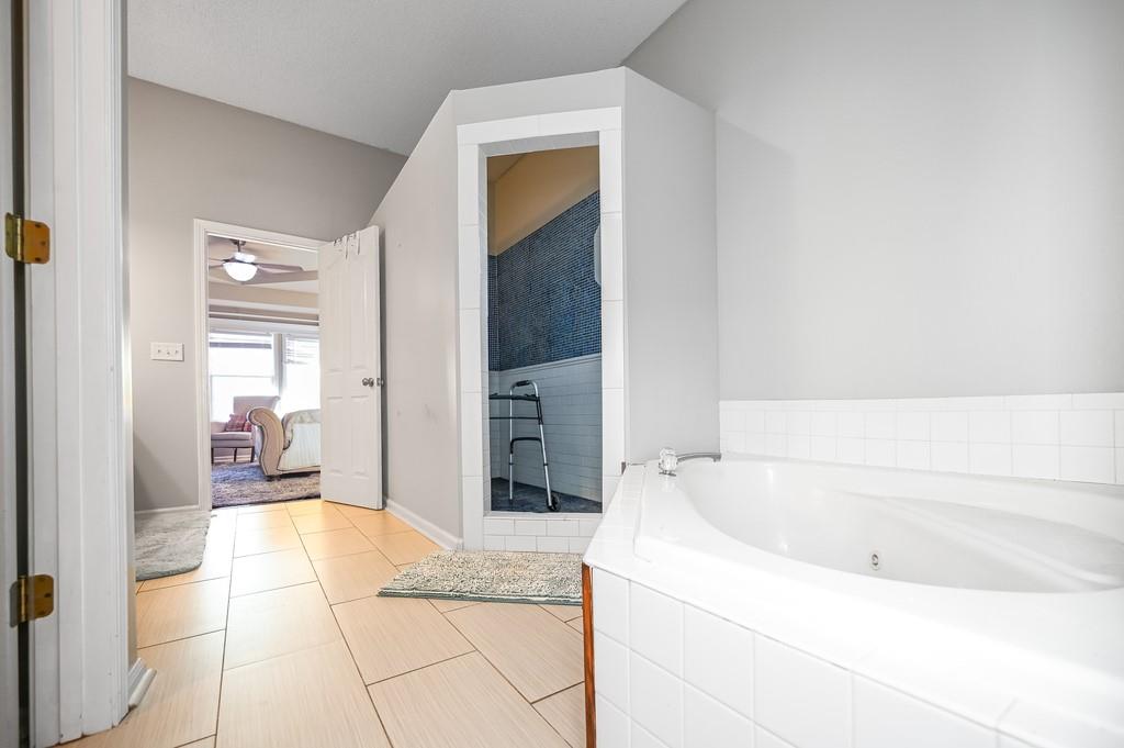Ensuite bathroom with a jetted tub, light tile patterned floors, ceiling fan, and a shower stall