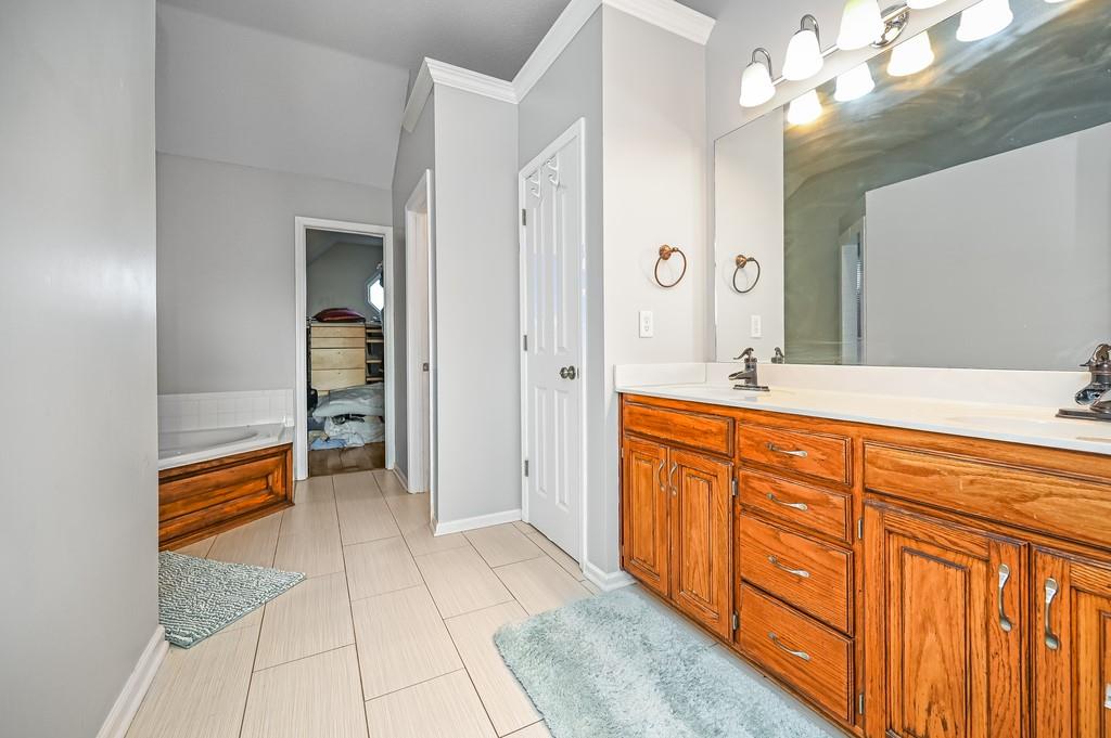 Full bath with double vanity, crown molding, light tile patterned floors, a garden tub, and a closet