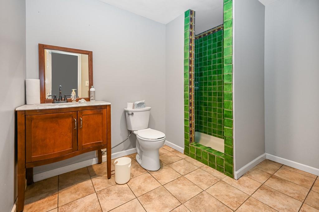Bathroom featuring vanity, a shower stall, and light tile patterned flooring